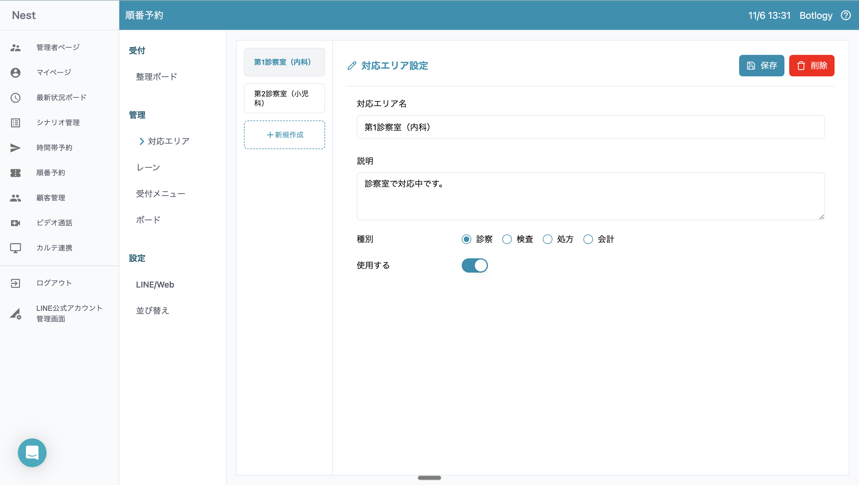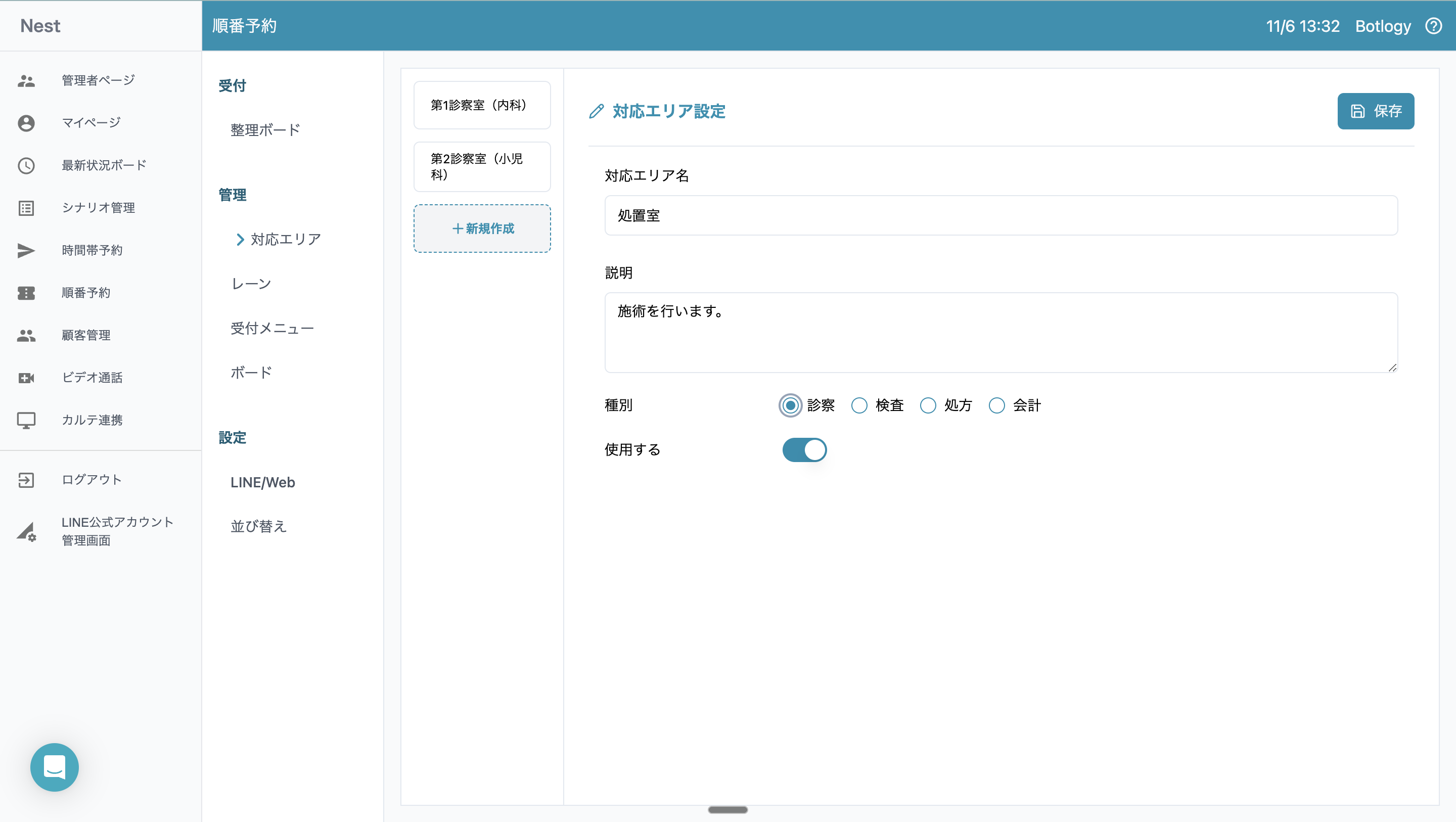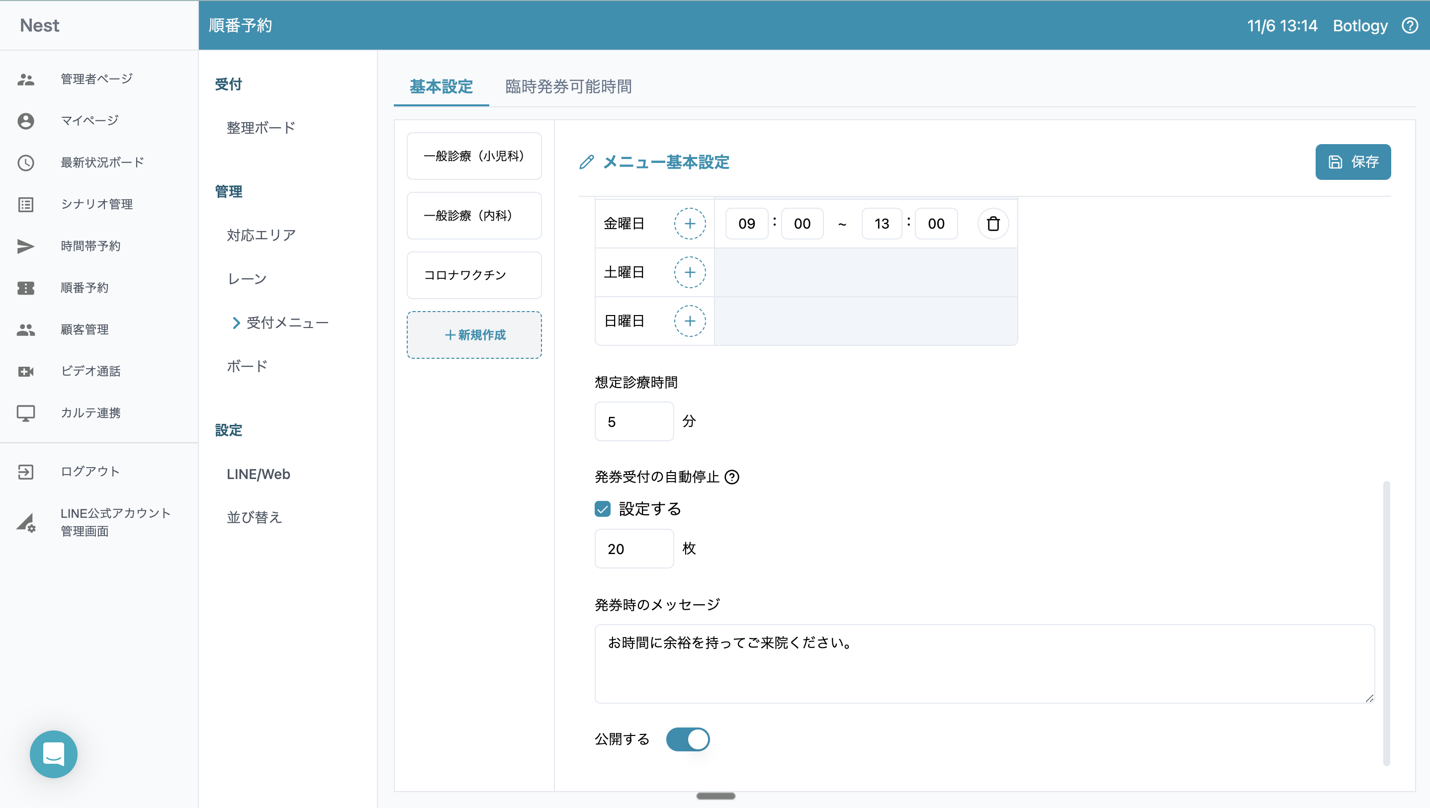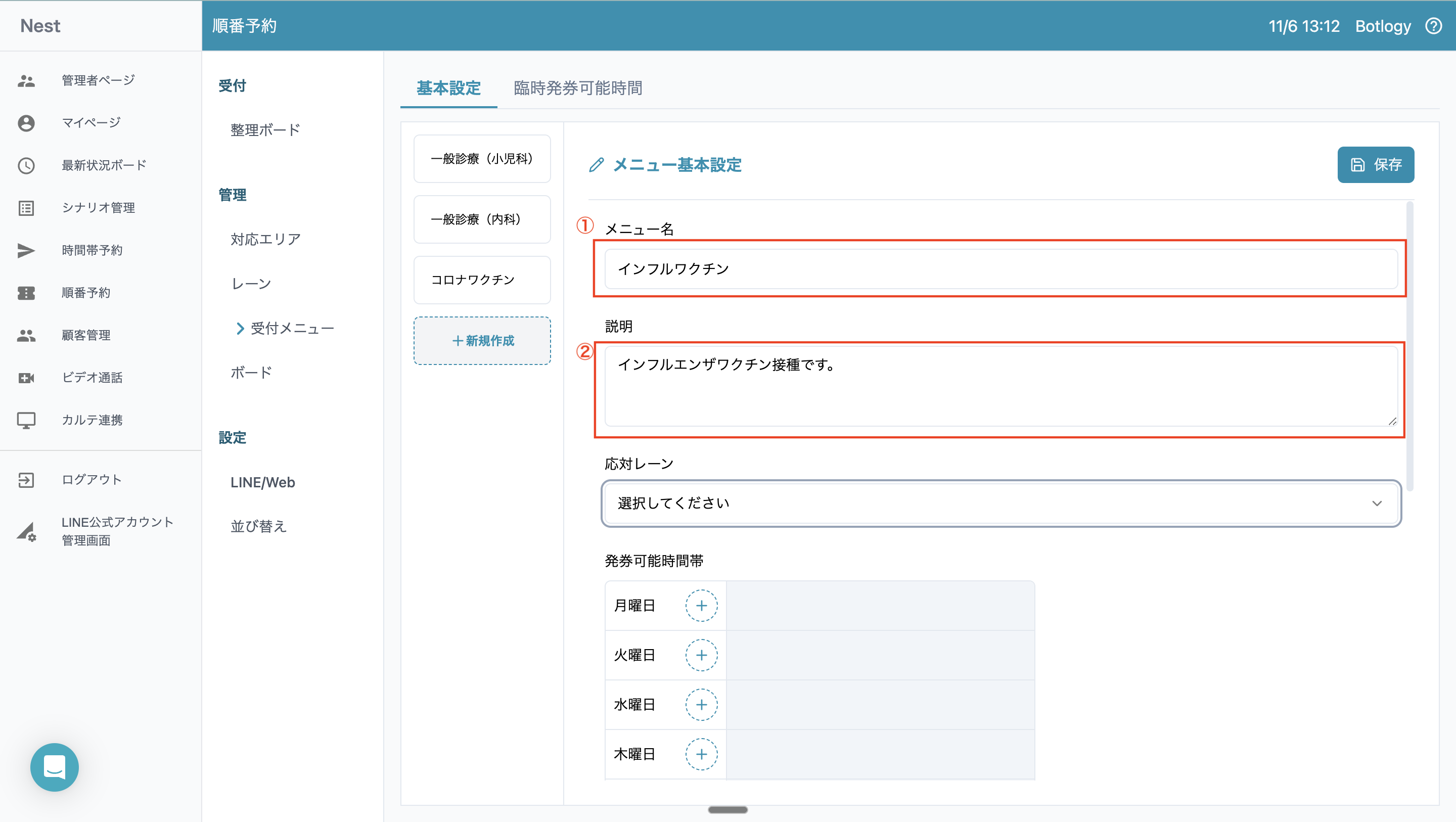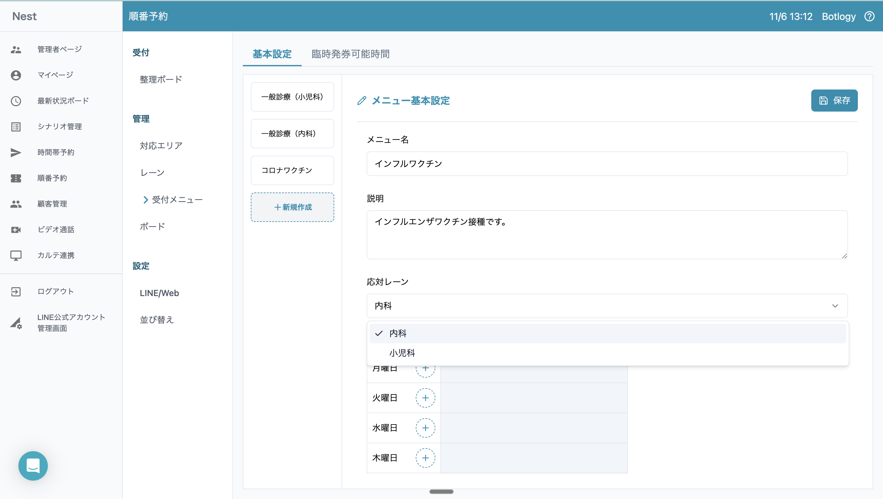 順番予約 | 診療内容に合わせてレーン・メニュー・対応エリアを作成する