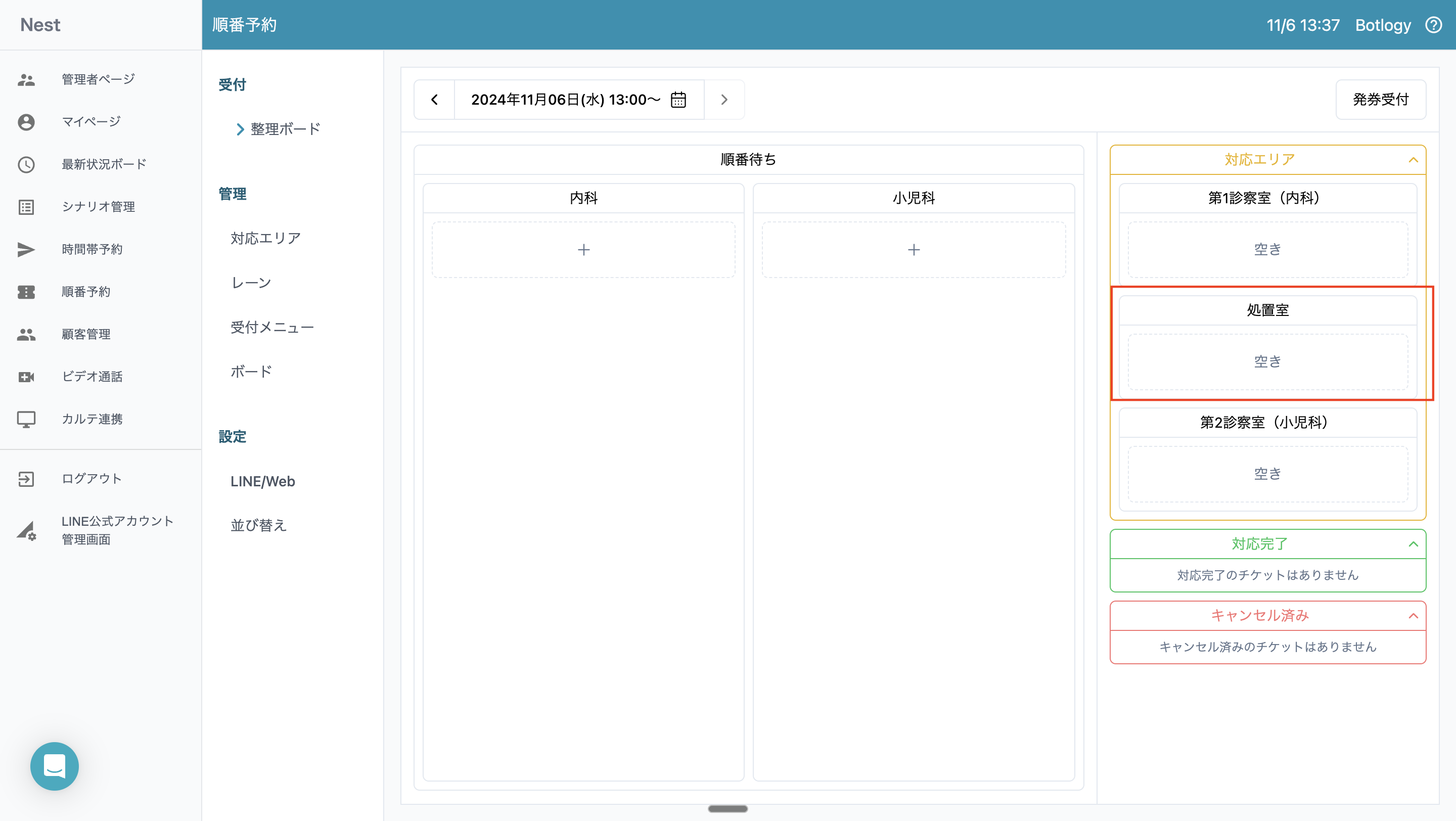 3. 整理ボードを確認すると、上記で追加した「処置室」の対応エリアが追加されていることを確認できます。