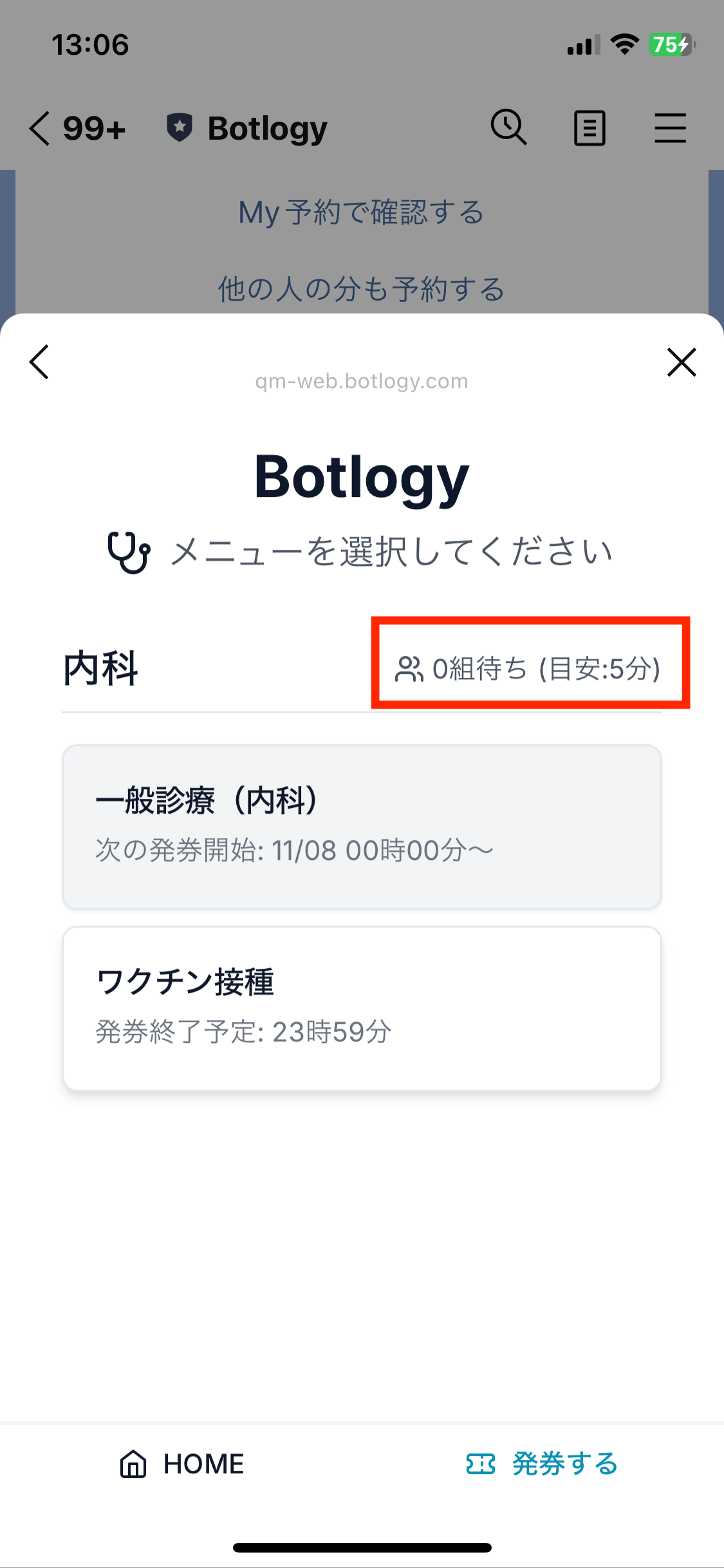 ※基本待機時間は、患者様の発券時に表示される目安時間のうち、何組待ちかに関係なく、デフォルトで加算される時間となります。例として、下記の画像のように基本待機時間を5分にした場合、0組待ちの場合でも、患者様には目安5分と表示されます。