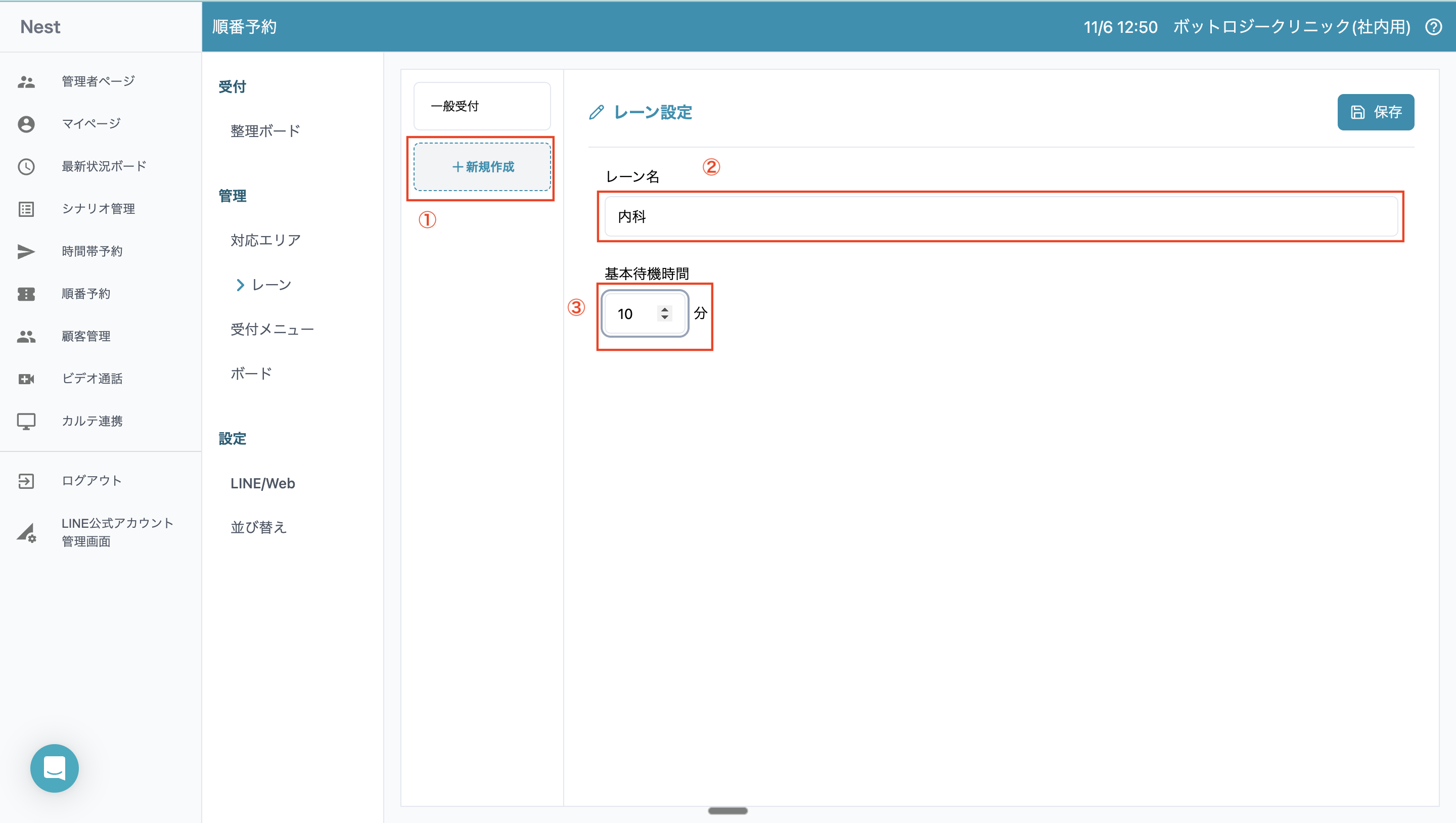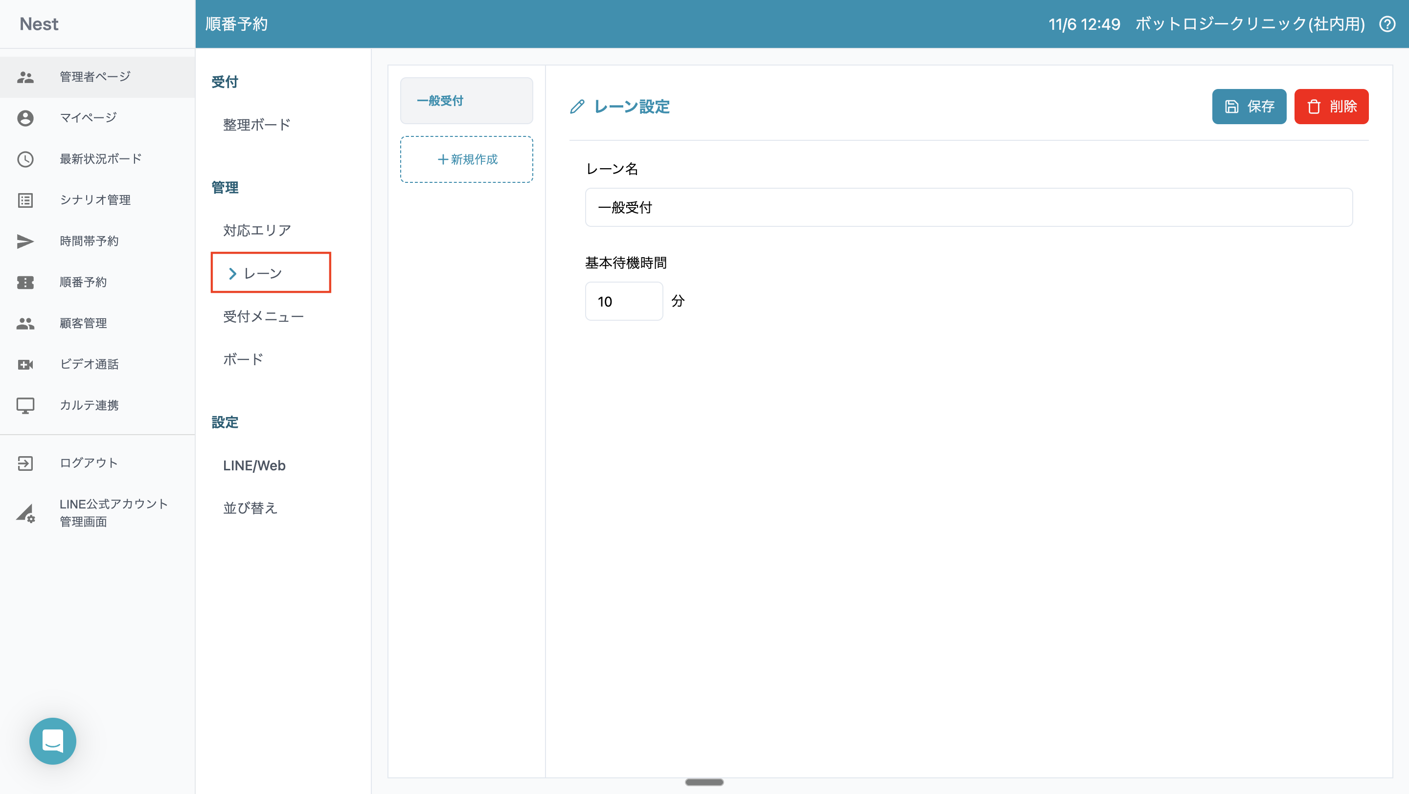 まずはじめに、レーンを作成しましょう。 レーンは患者様が並ぶ列のことで、例えば内科の1診制のクリニックの場合は、「内科」というレーンが1つ、内科と小児科の2診制の場合は「内科」と「小児科」の2つのレーンを作成します。