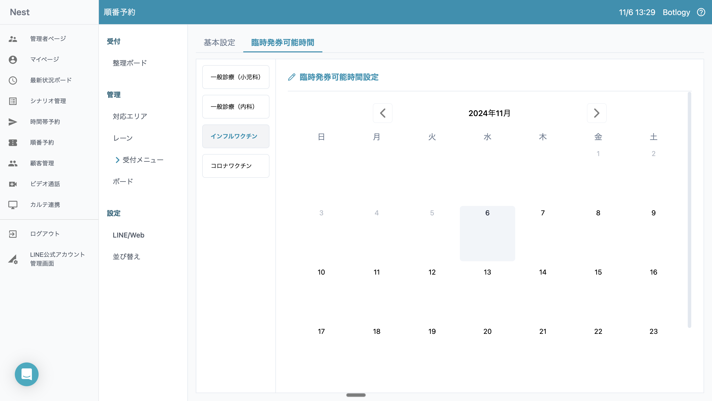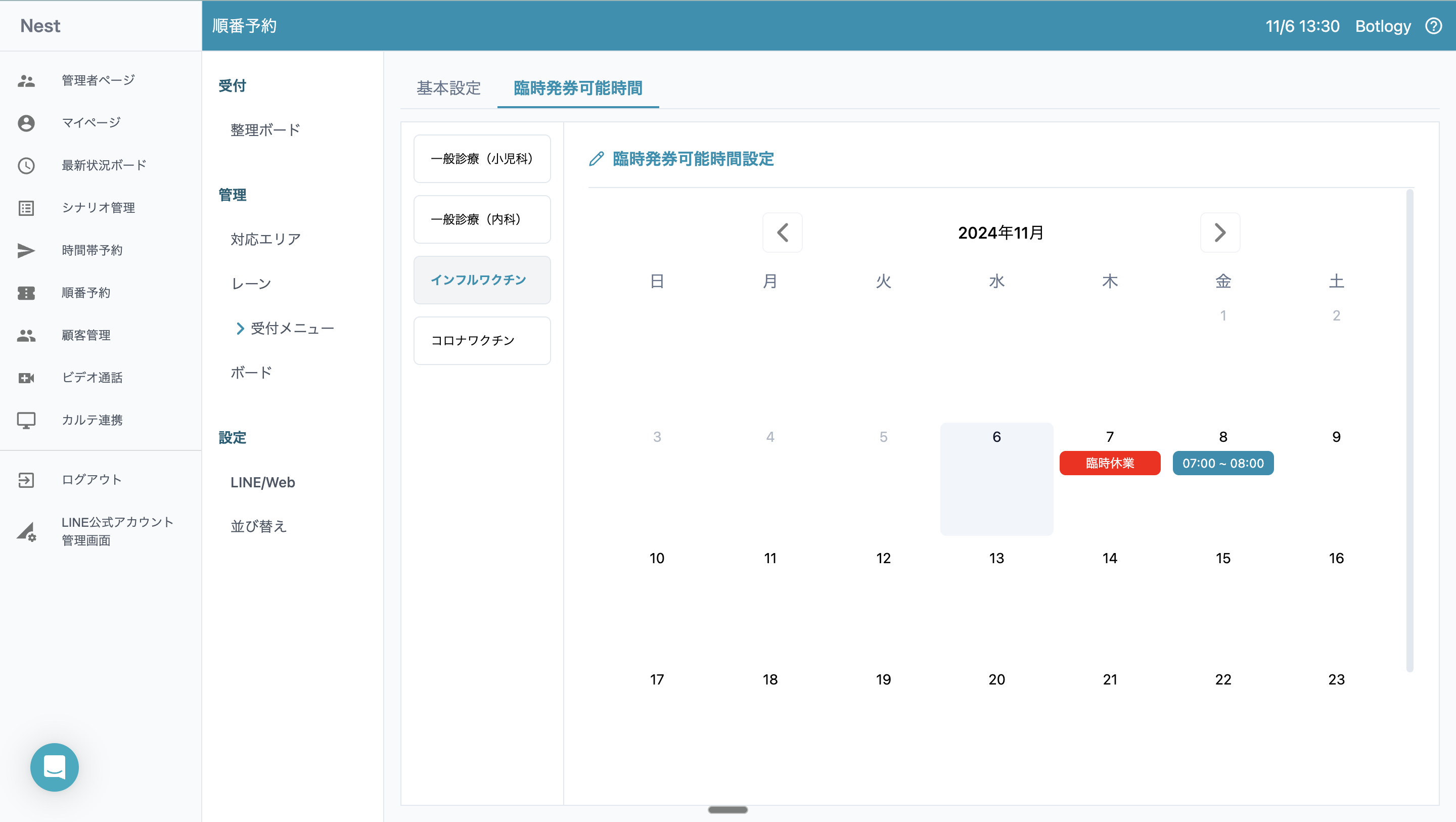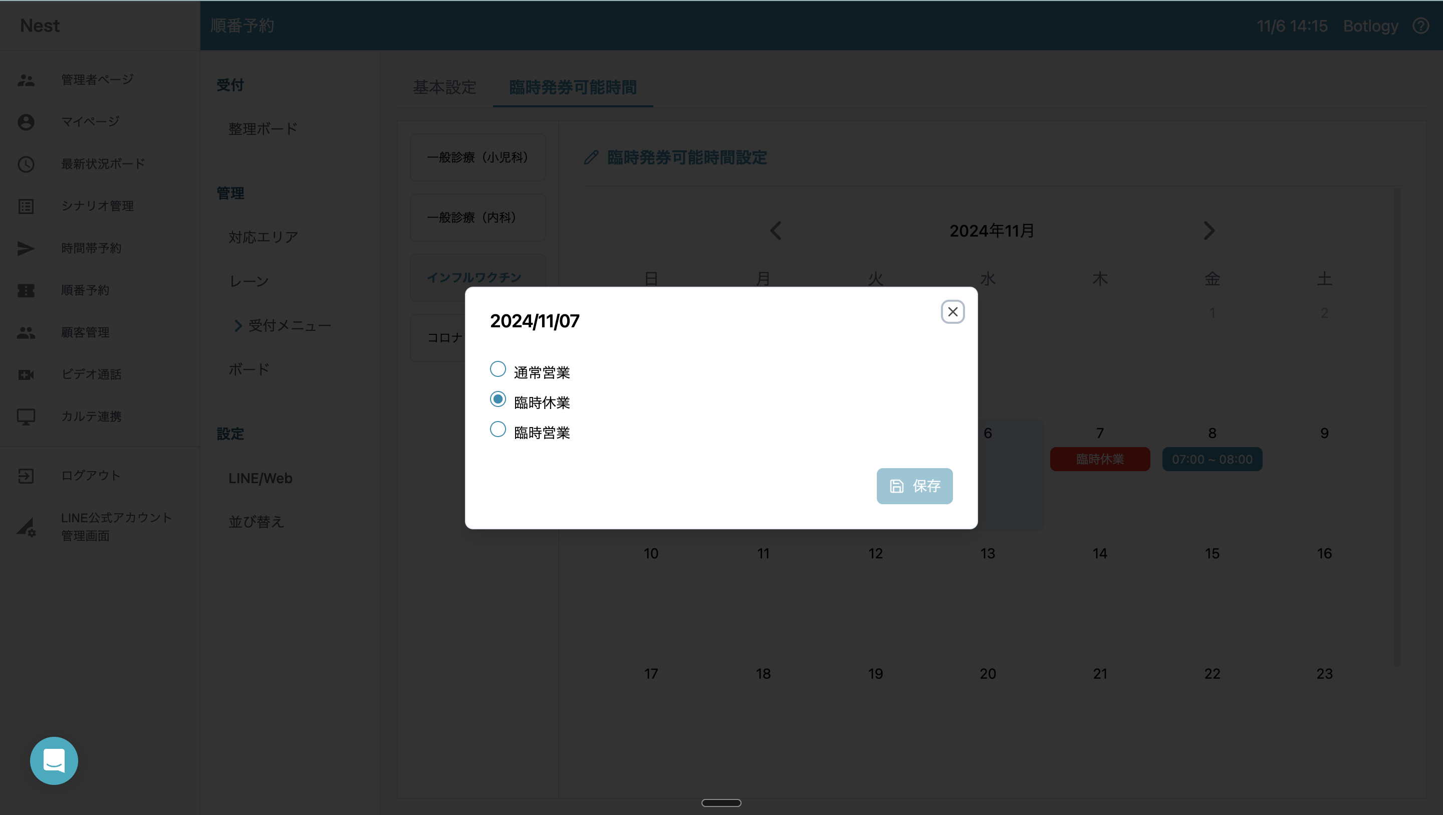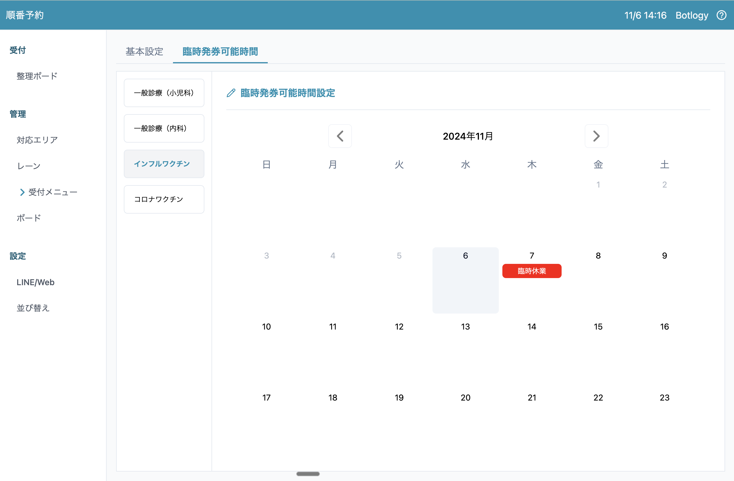 医療機関には祝日や医師の学会等への参加によって、受付メニューで設定した発券可能時間に診察ができない場合があります。逆に、臨時で営業する場合もあるため、あらかじめ臨時の営業や休業時間を設定しておく必要があります。