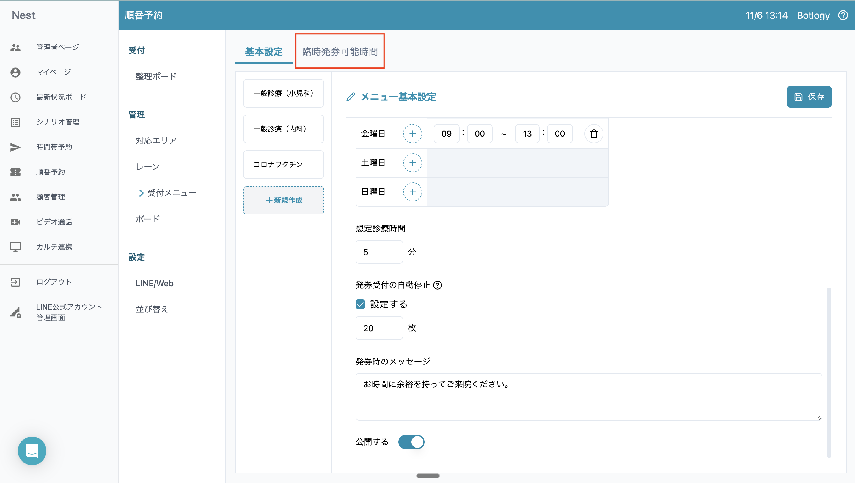 1. [受付メニュー] をクリックし、[臨時発券可能時間] をクリックします。
