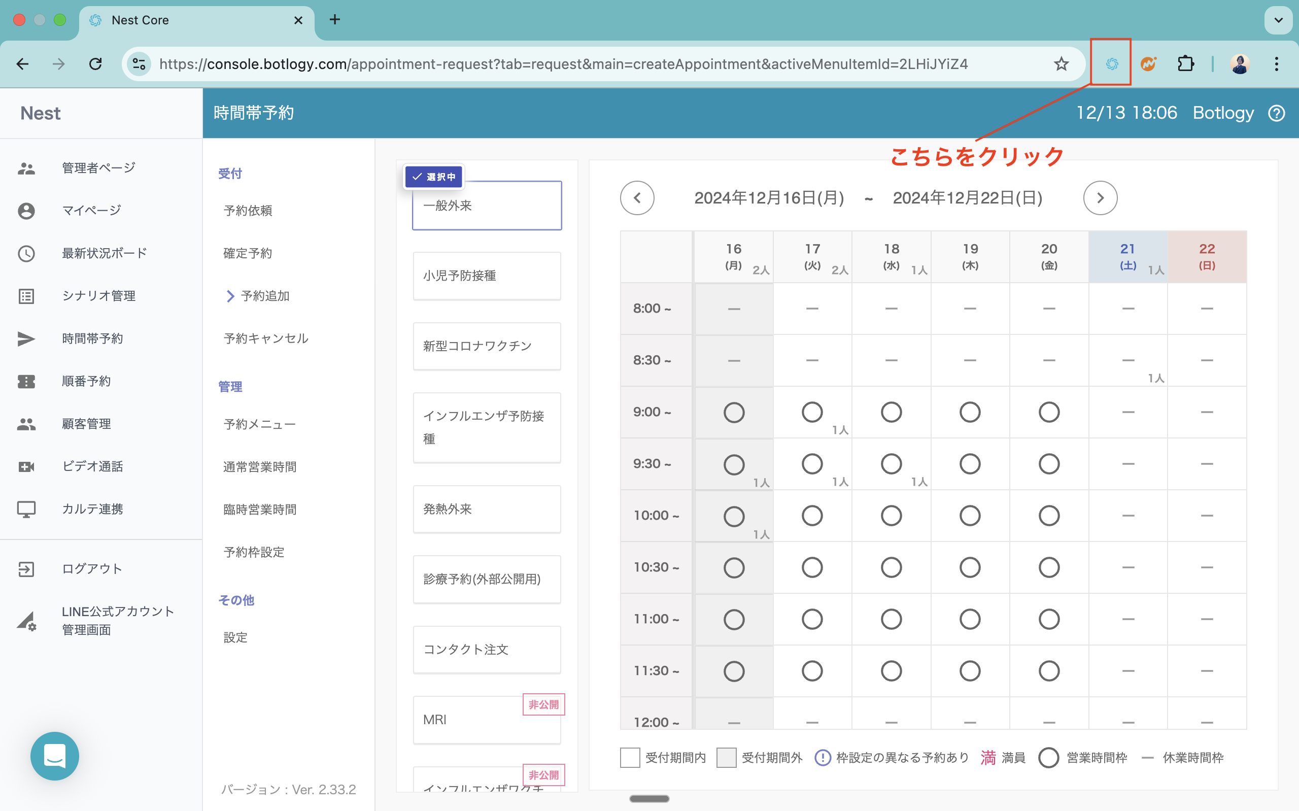 予約受付支援機能はGoogle Chromeの拡張機能として作動するため、利用時には拡張機能の一覧から、予約受付受付支援機能をクリックする必要があります。