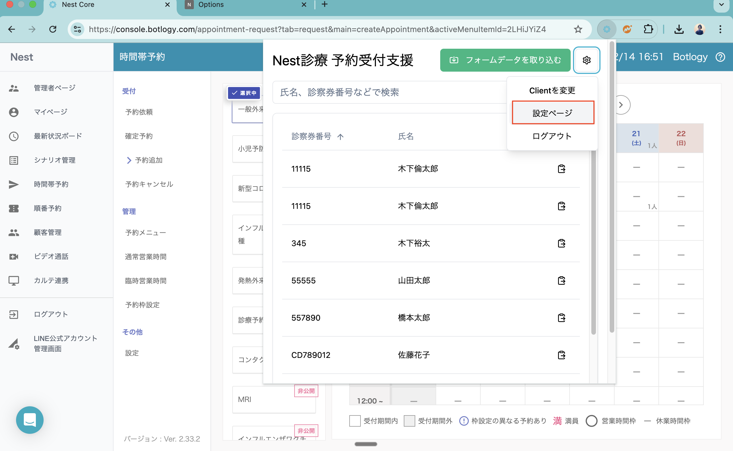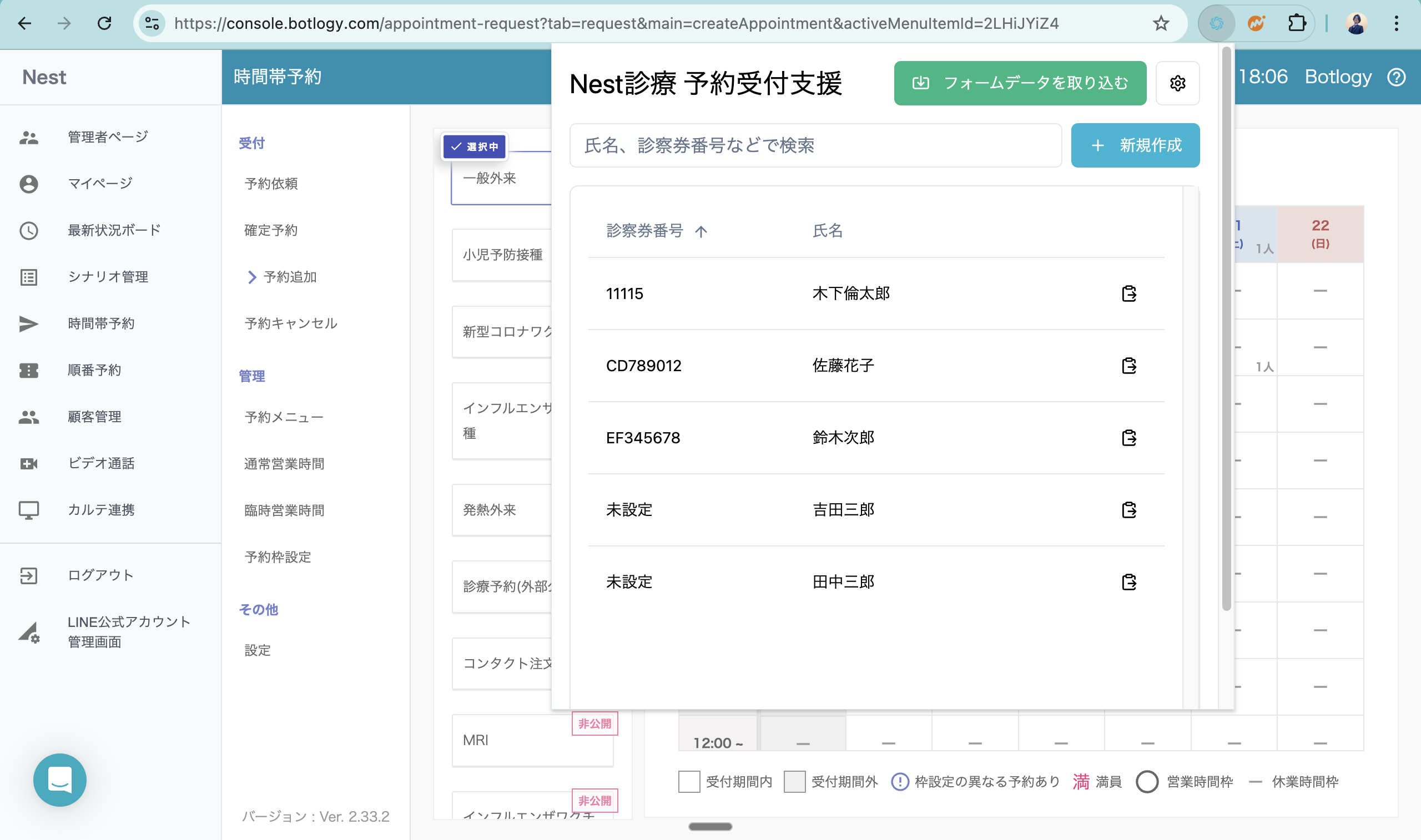 Nest診療の予約受付支援機能は患者様の情報(氏名、診察券番号等)を登録可能で、予約受付支援機能に登録された情報を予約追加時に用いることで、業務を効率化します。