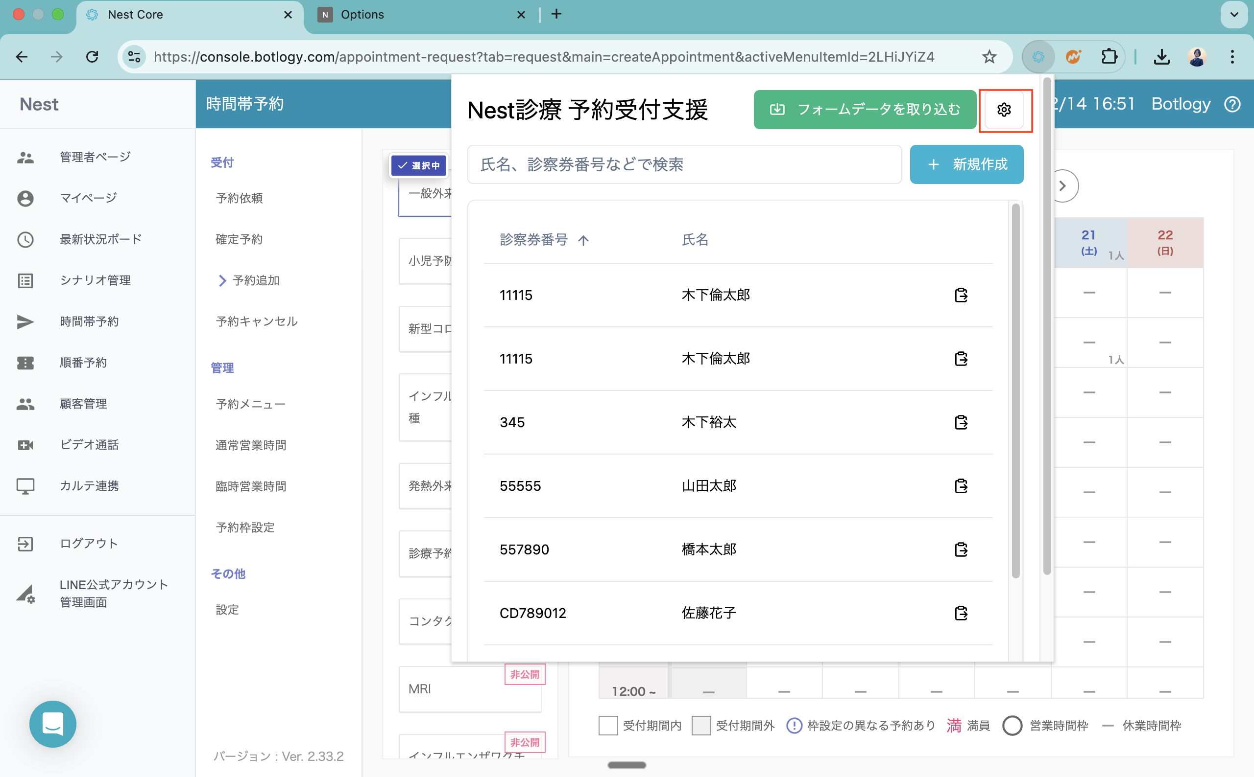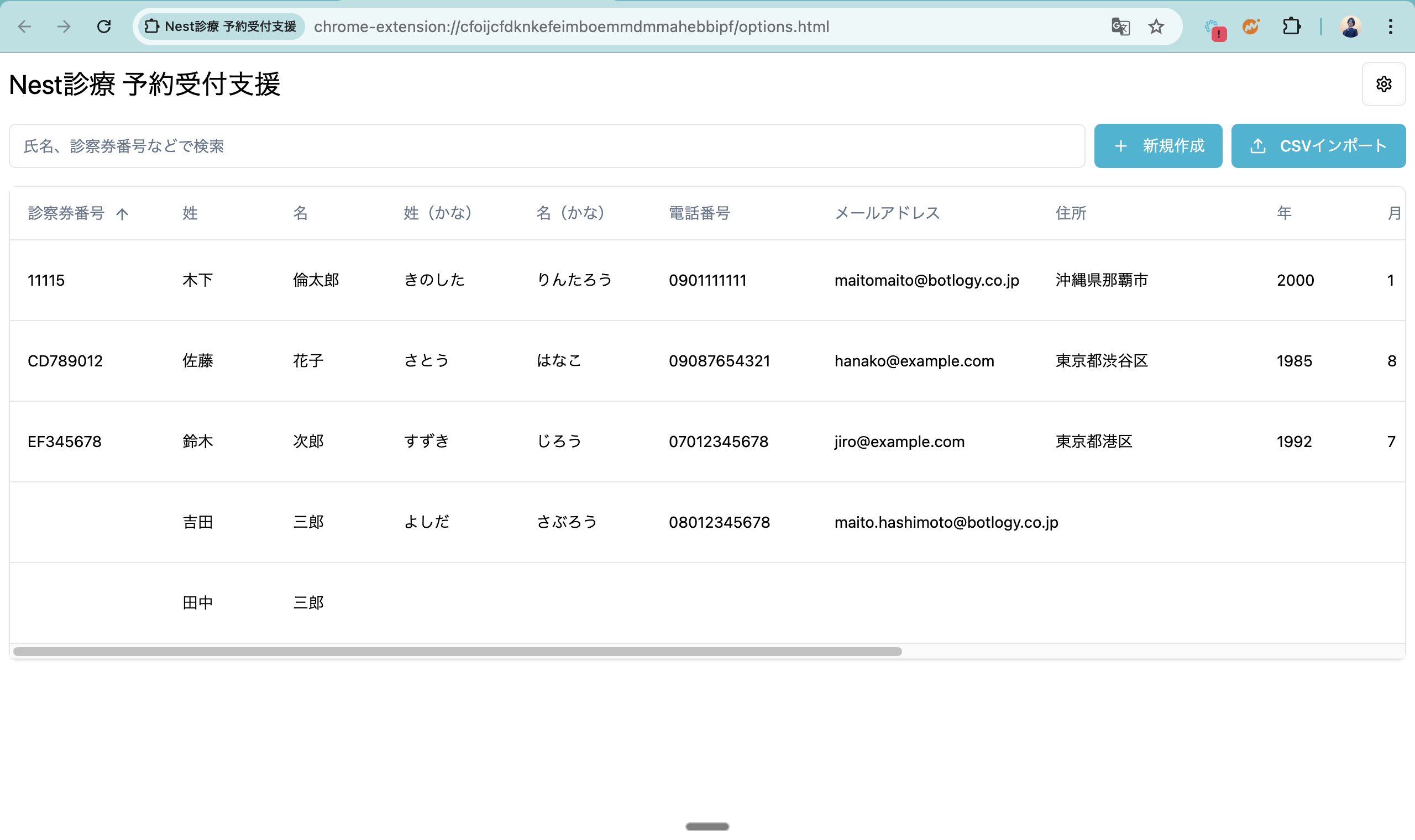 ポップアップでは、予約追加フォームへの患者様情報の反映、患者様の検索、患者様の情報の登録・編集・削除、フォームデータの取り込み等が可能です。