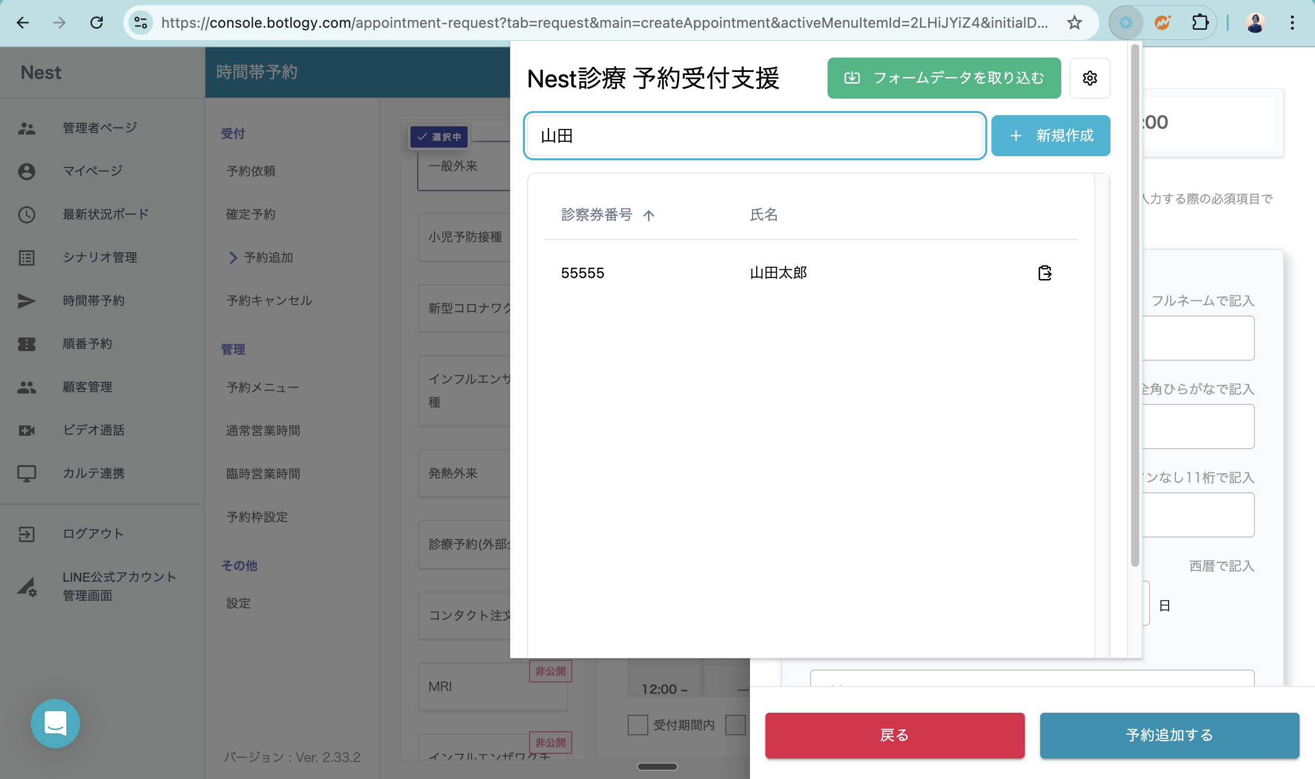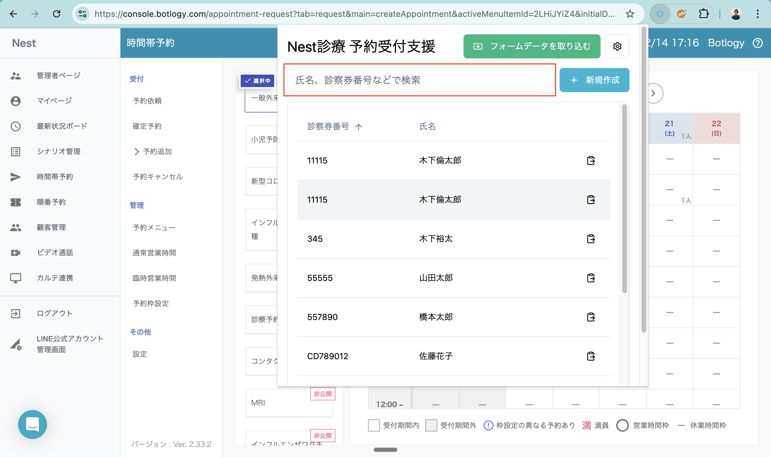 3. 予約受付支援機能を立ち上げ、検索欄から患者様を検索します。