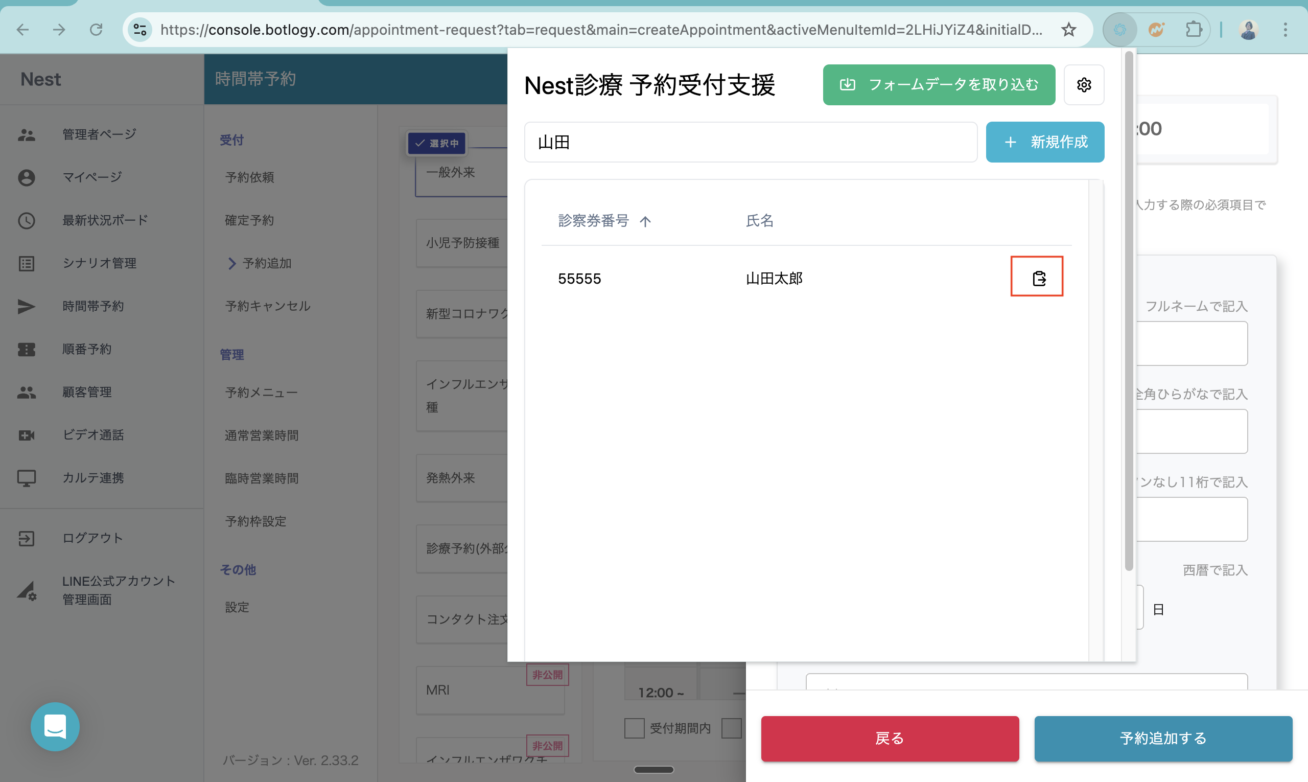 5. ポップアップを閉じ、フォームに情報が追加されたのを確認して、[予約追加する] をクリックします。