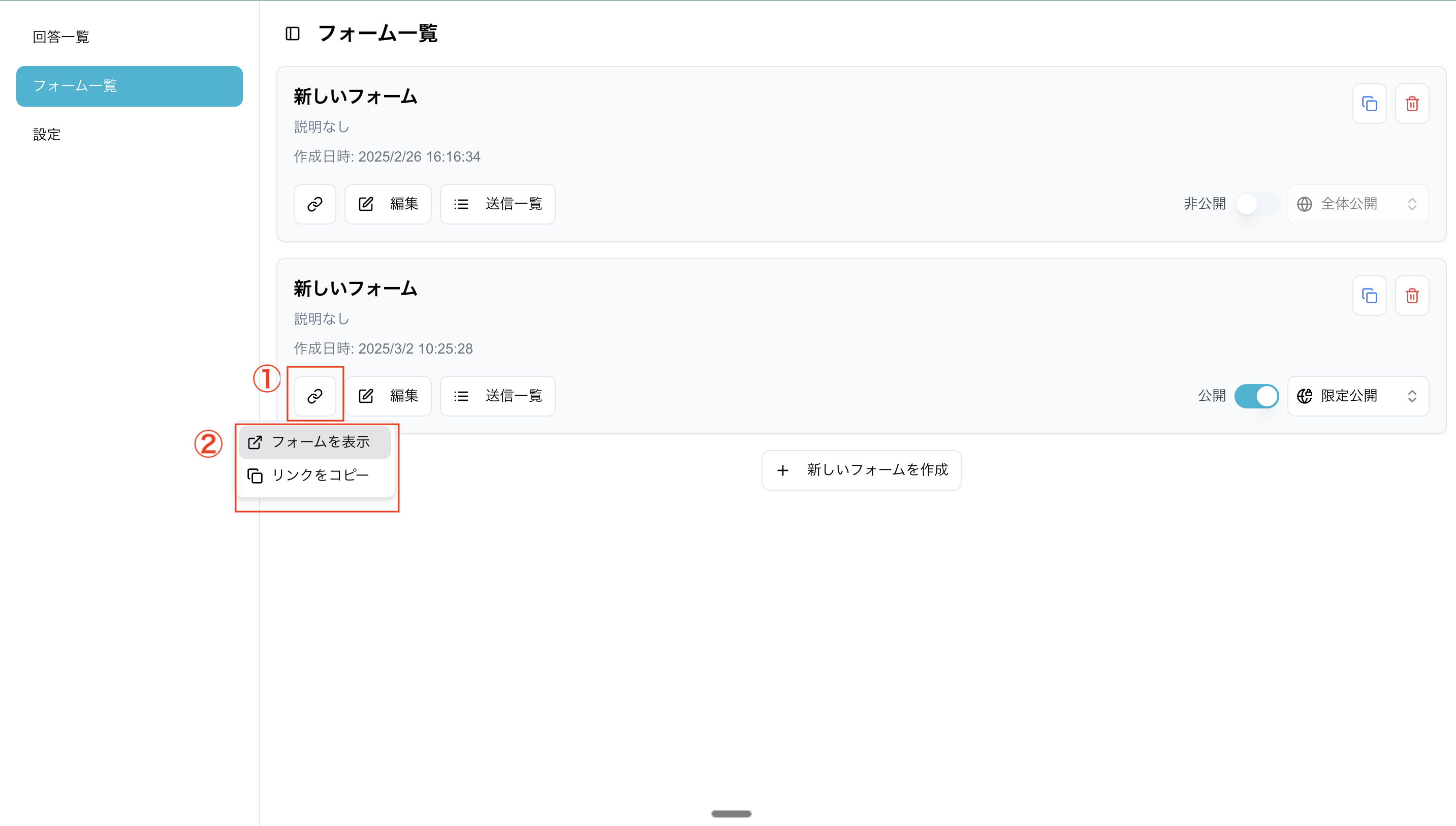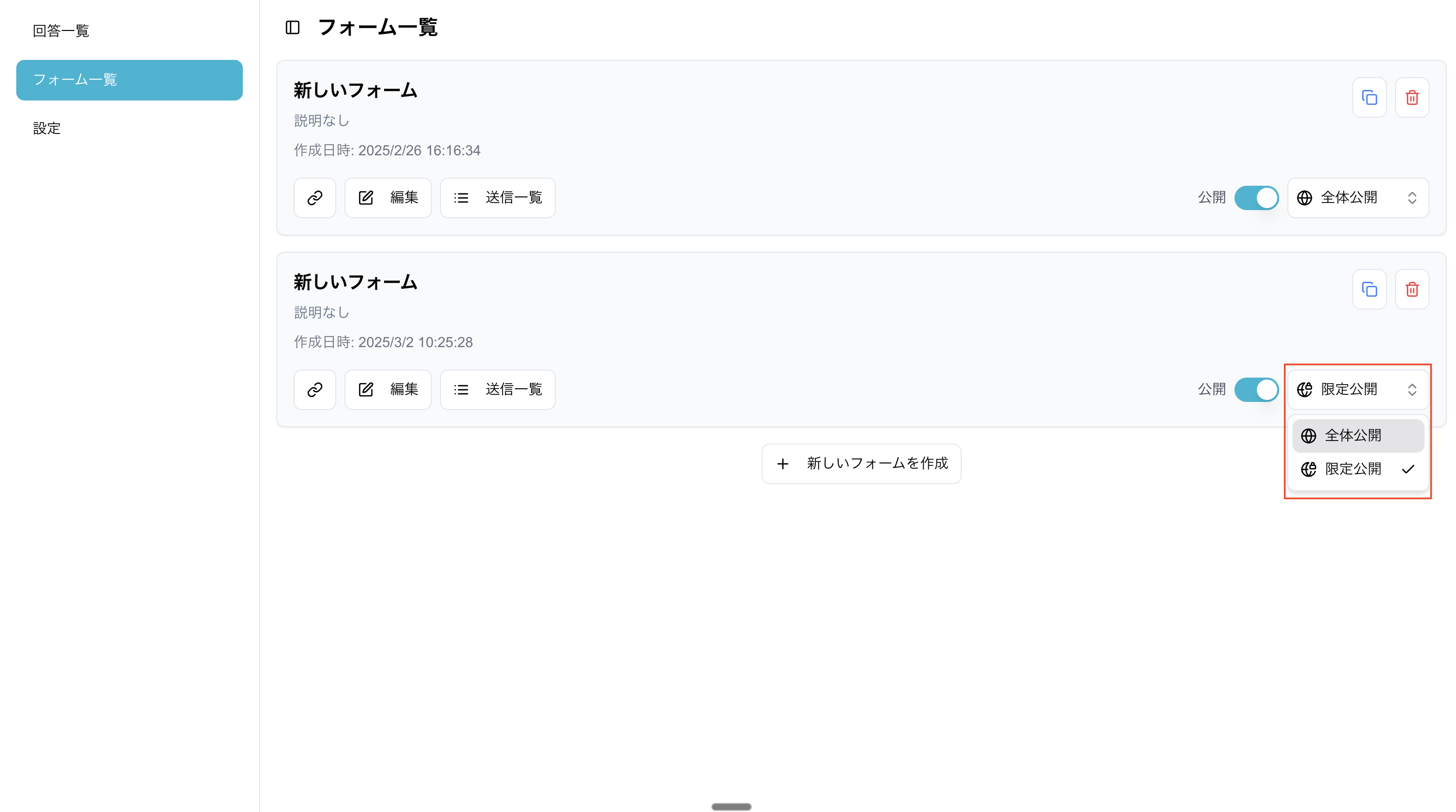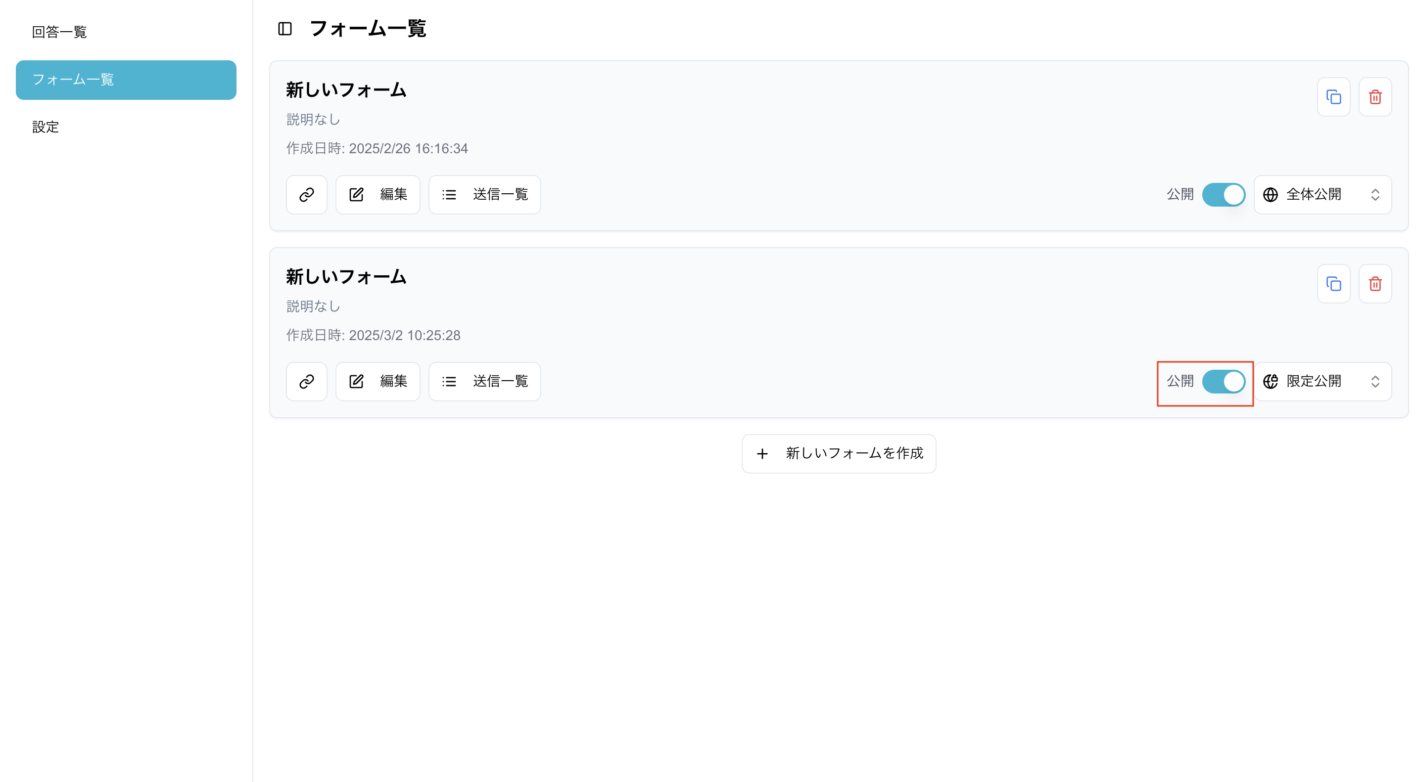 1. フォーム一覧より、公開したいフォームの公開のトグルをONにします。