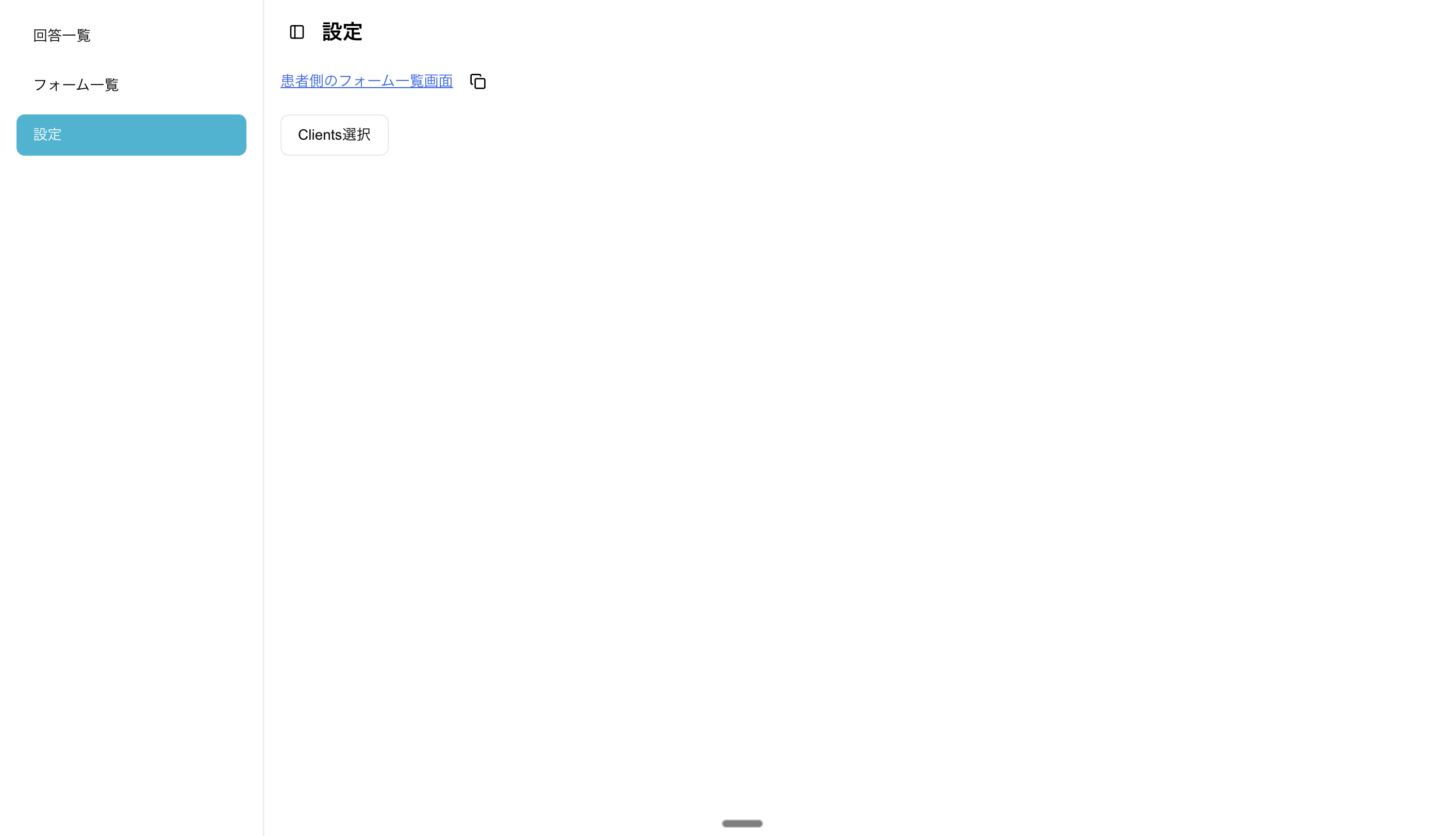1. サイドバーより[設定]にアクセスし、[患者側のフォーム一覧画面]をクリックするとフォーム一覧の画面が表示されます。またはコピーのアイコンを押すとURLが取得できます。