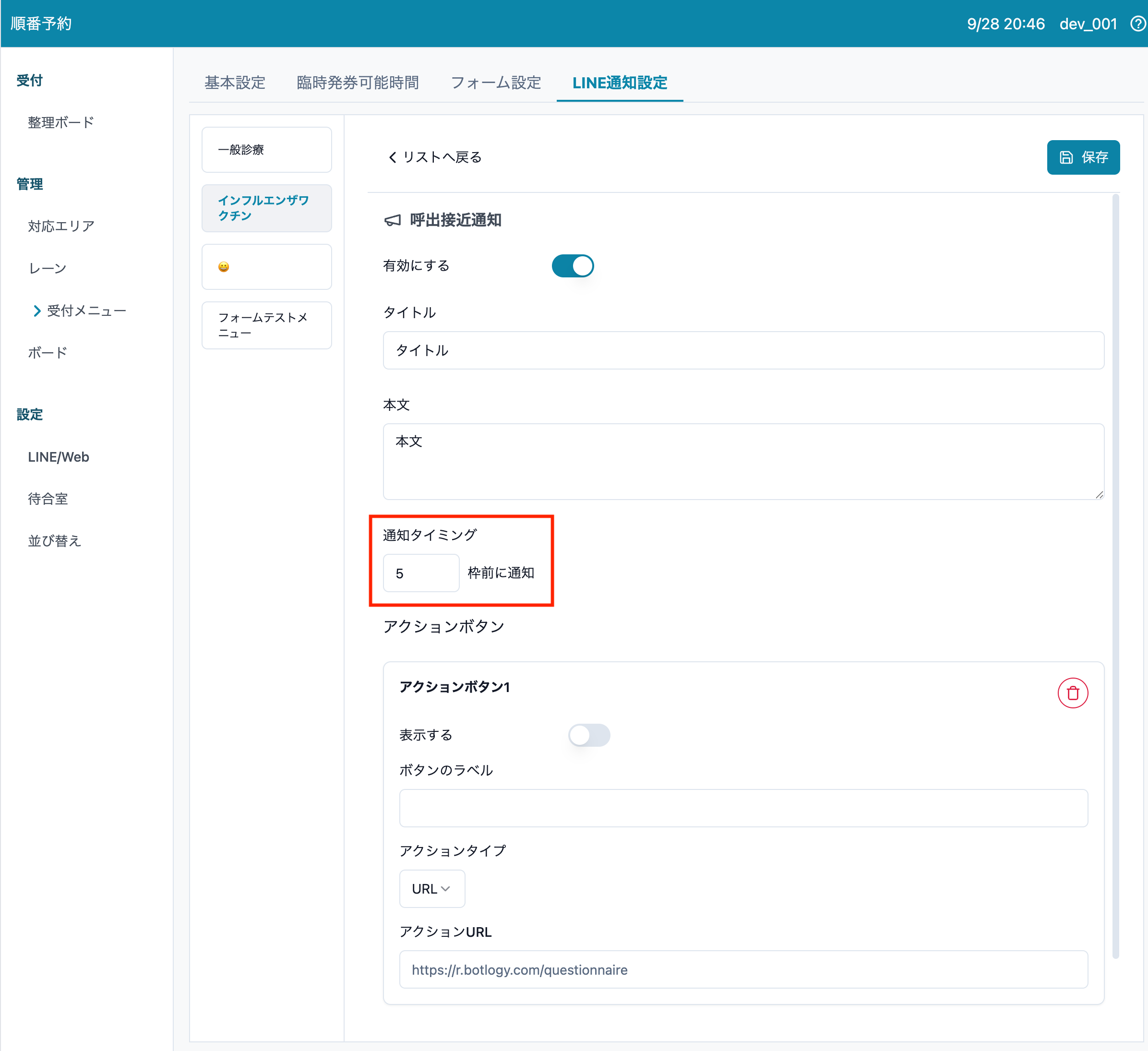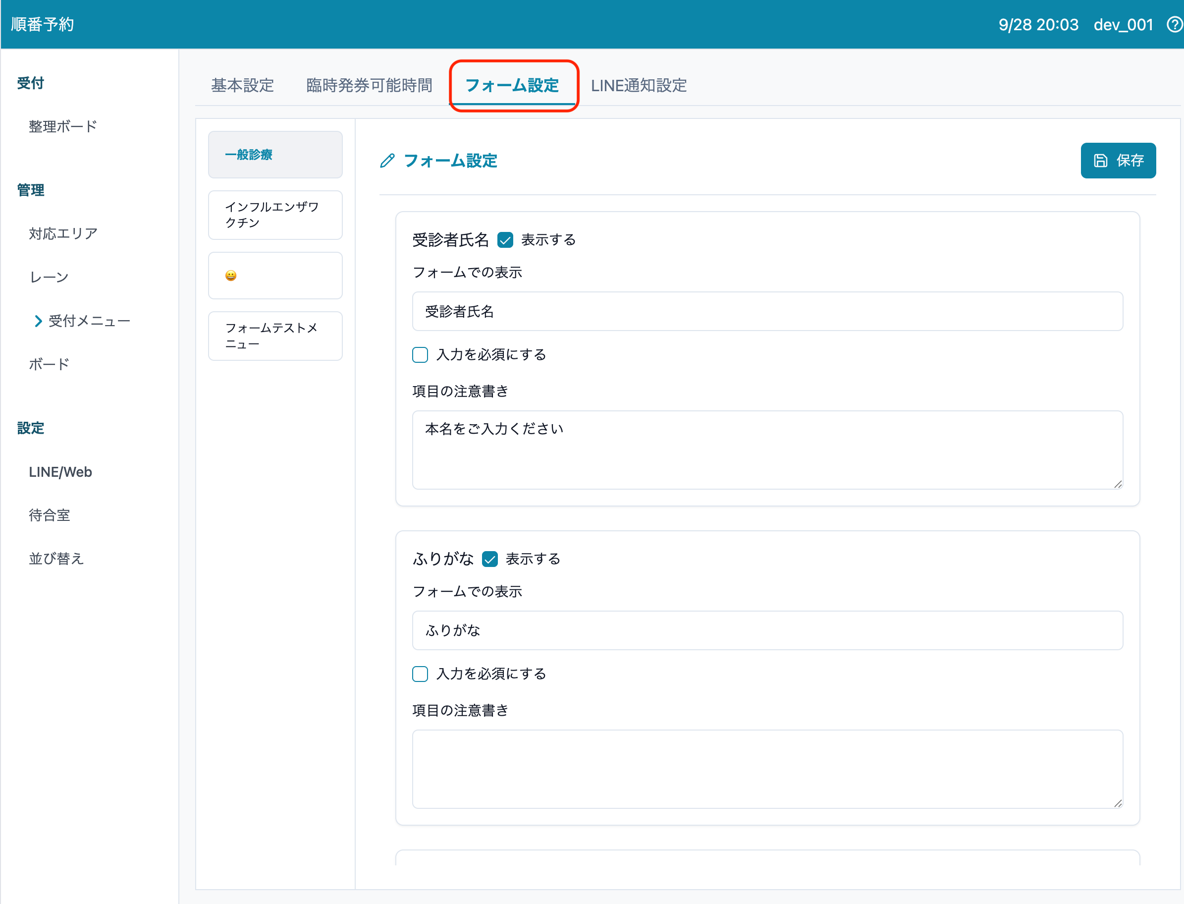 1. 順番予約 > 受付メニュー > フォーム設定 に移動します。