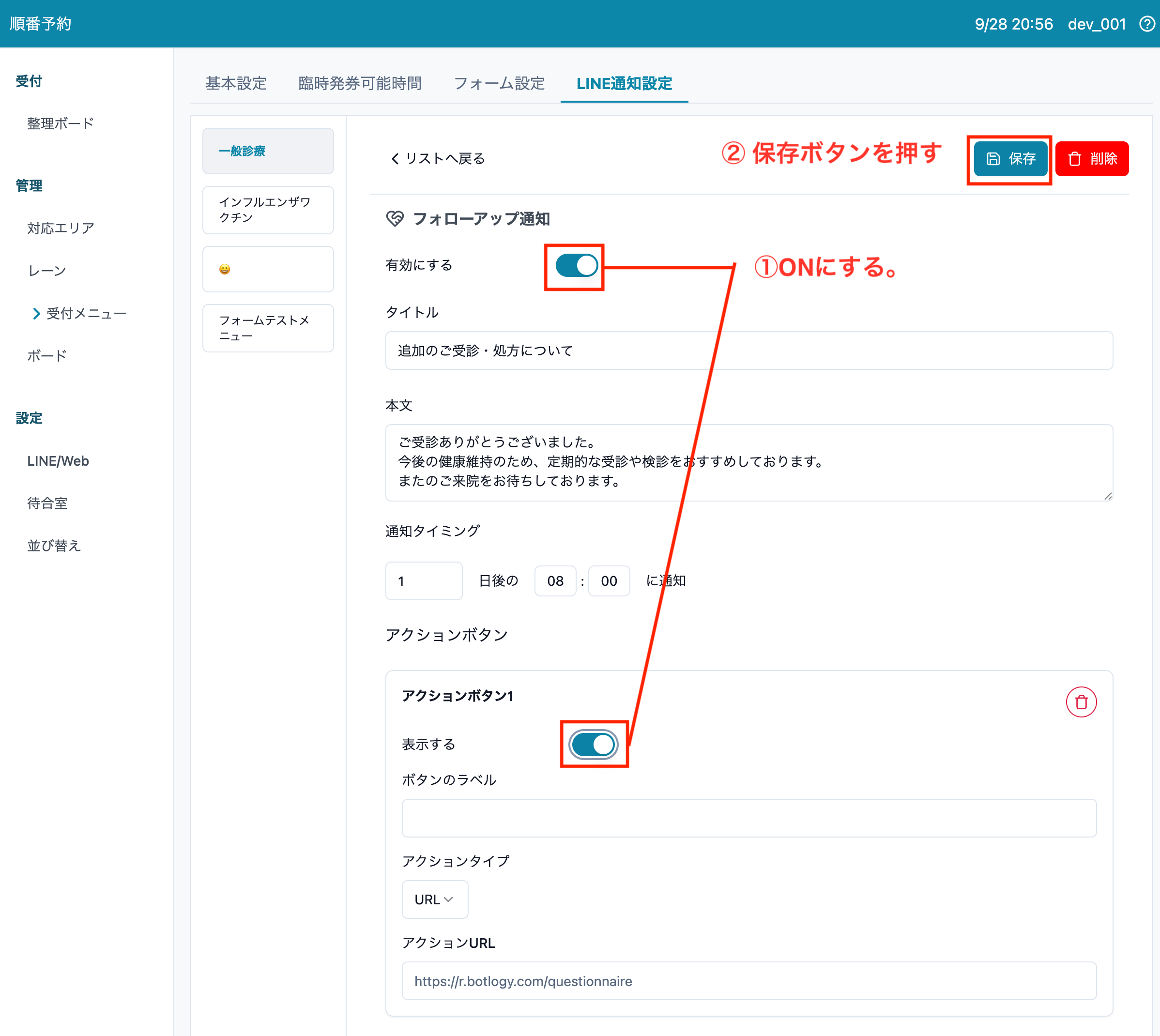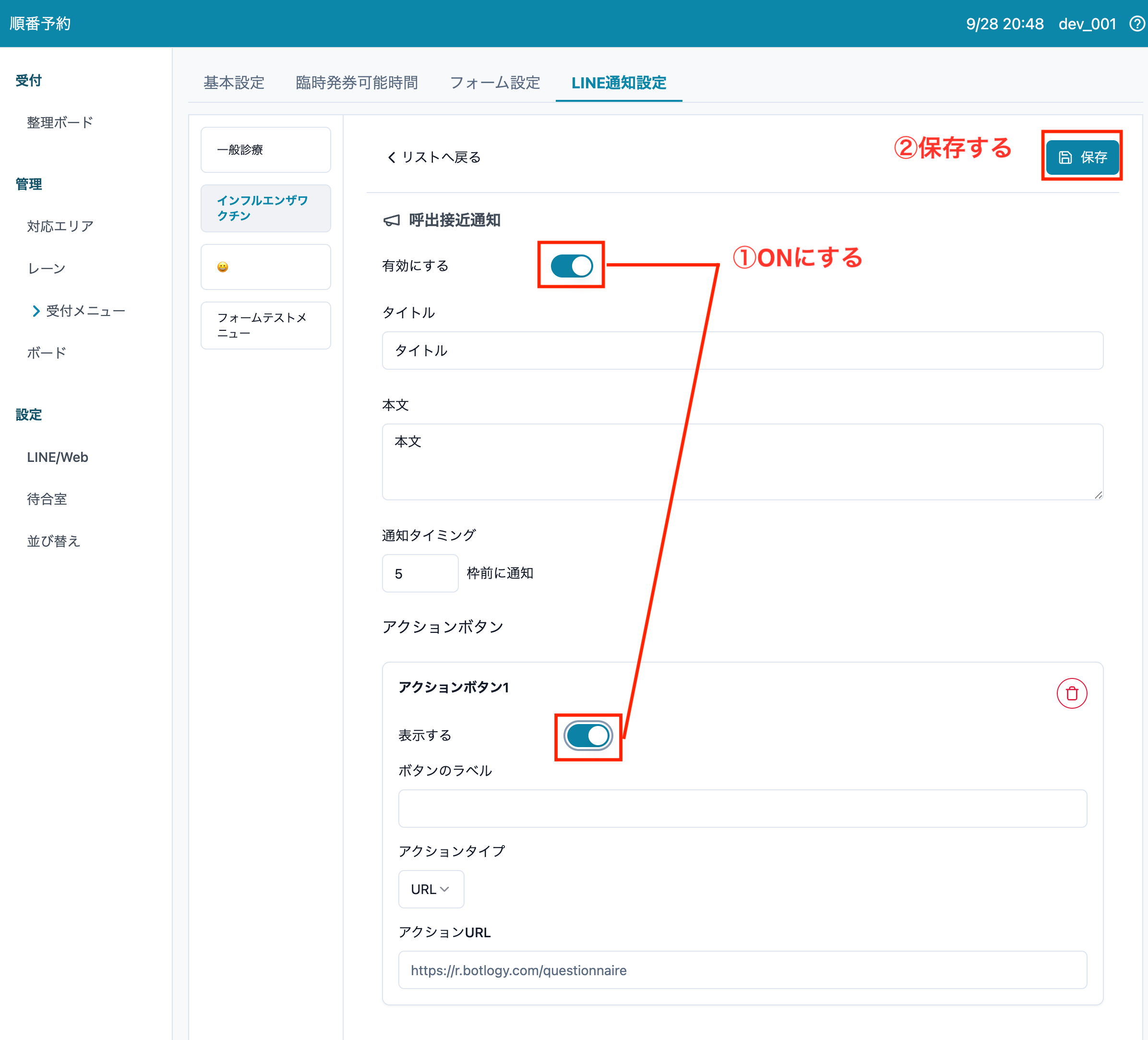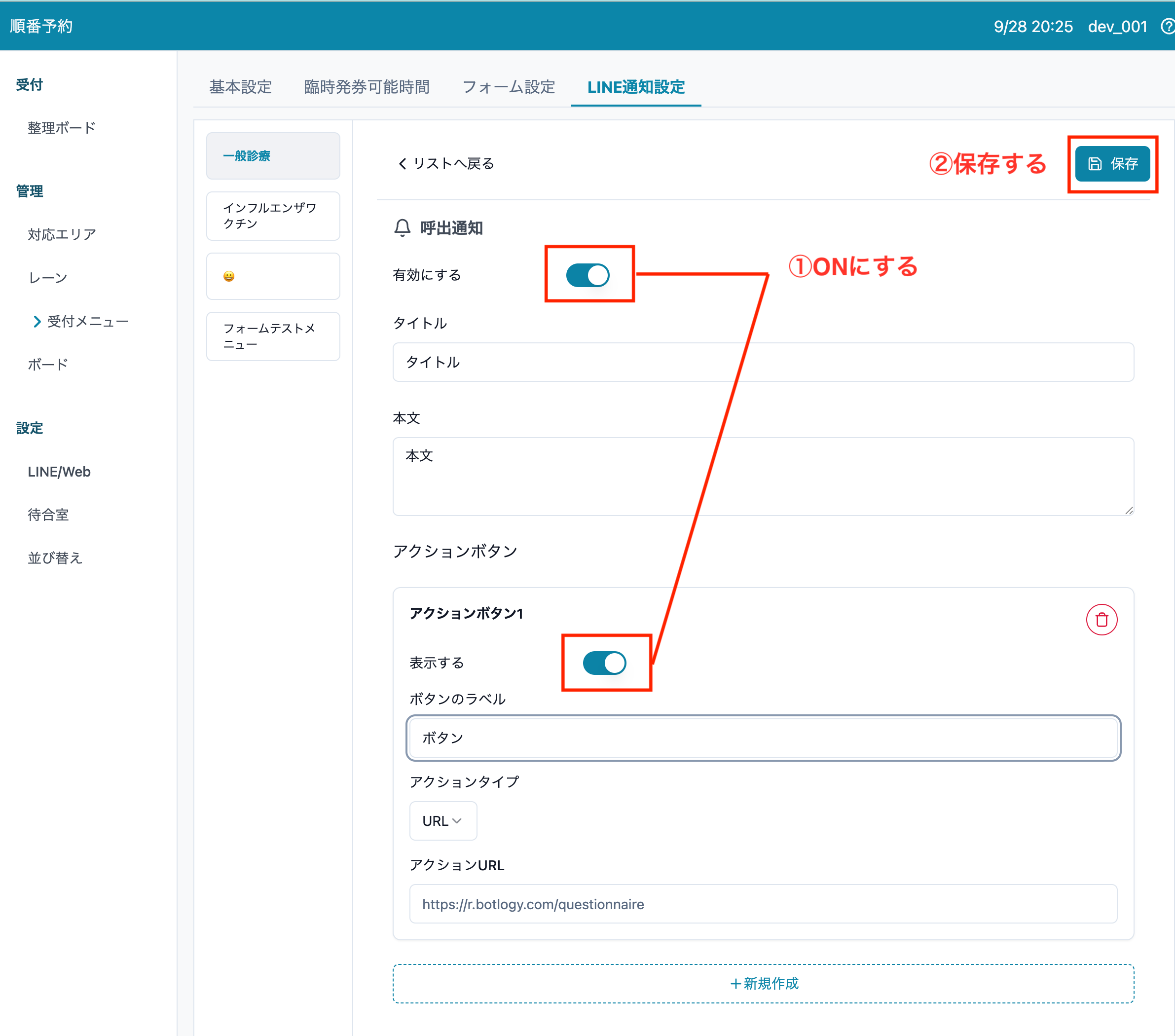 3. 呼び出し通知の"有効にする"および追加した場合はアクションボタンの"表示する"トグルをONにして、[保存する] ボタンを押します。