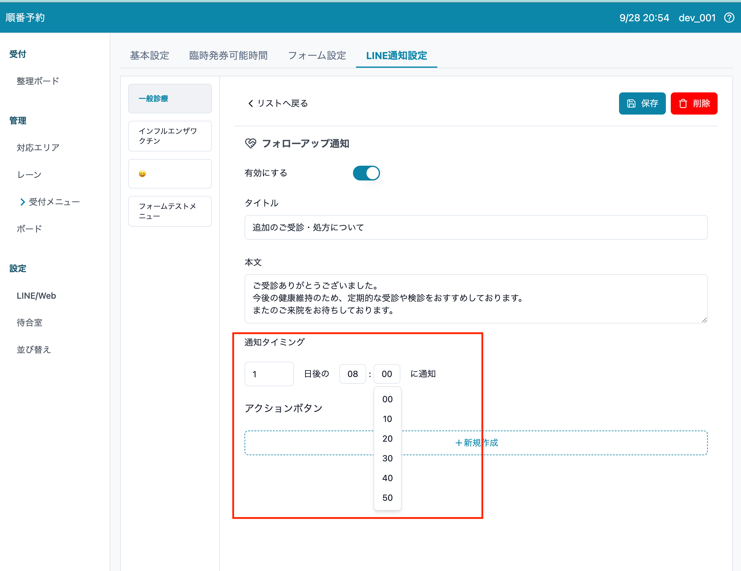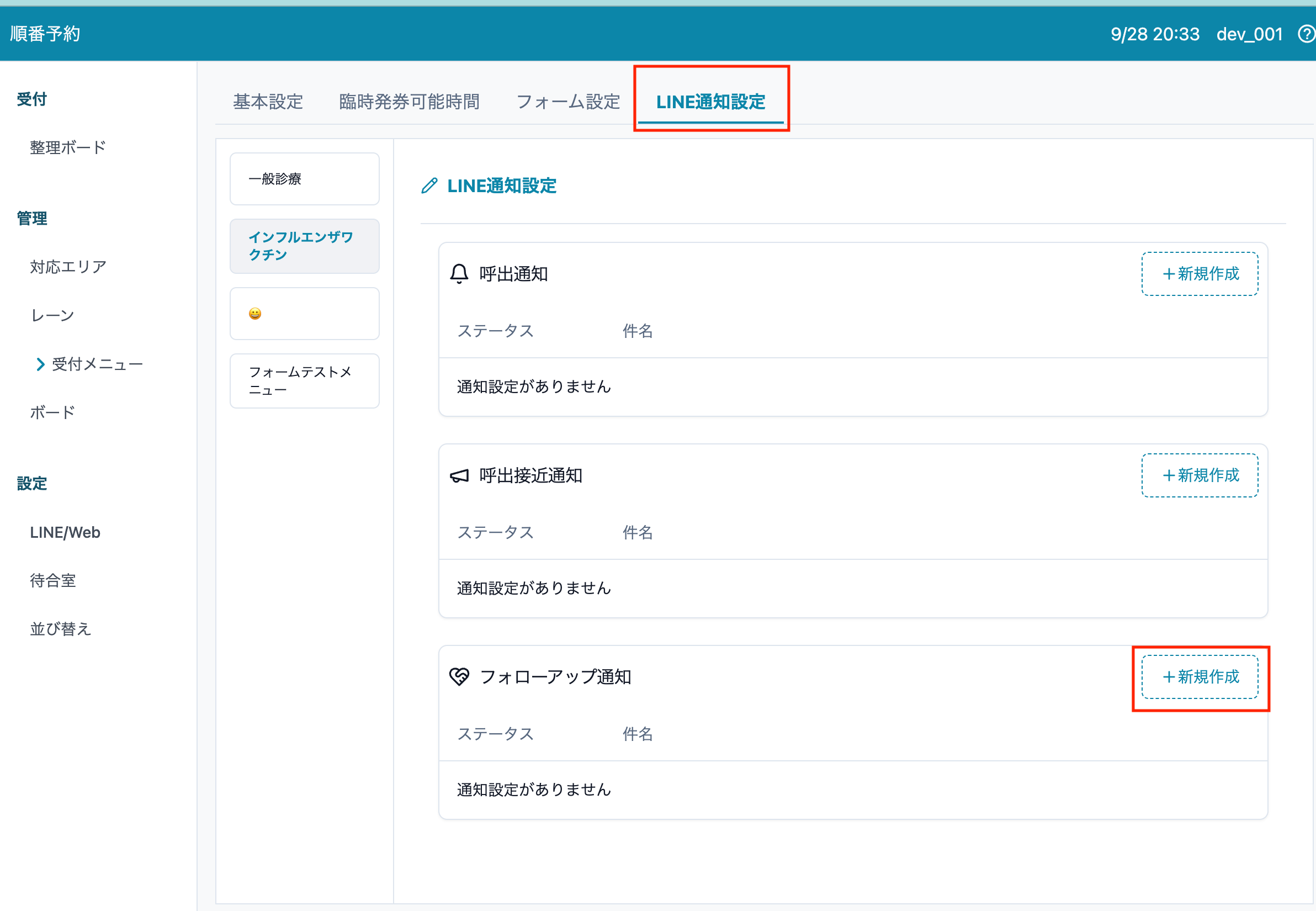 1. 順番予約 > 受付メニュー > LINE通知設定 > フォローアップ通知 > [新規作成] を押します。