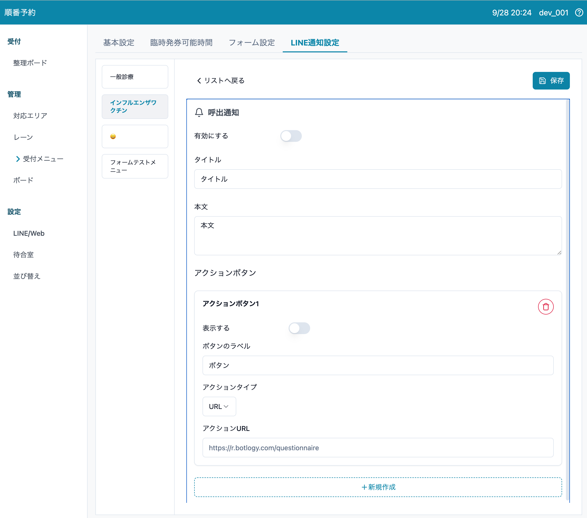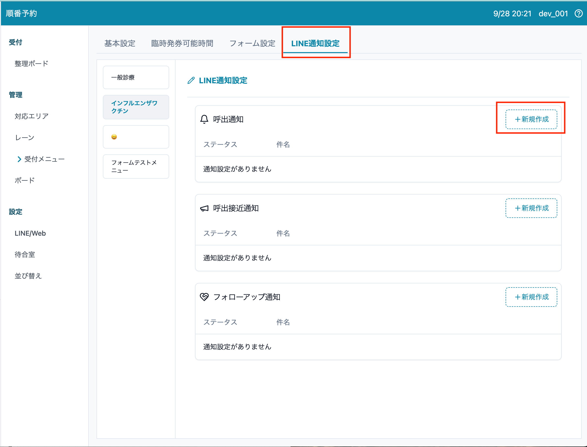 1. 順番予約 > 受付メニュー > LINE通知設定 > 呼び出し通知 > [新規作成] を押します。