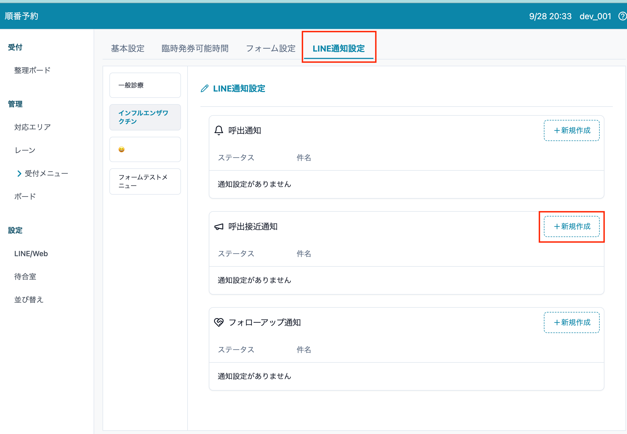 1. 順番予約 > 受付メニュー > LINE通知設定 > 呼び出し接近通知 > [新規作成] を押します。