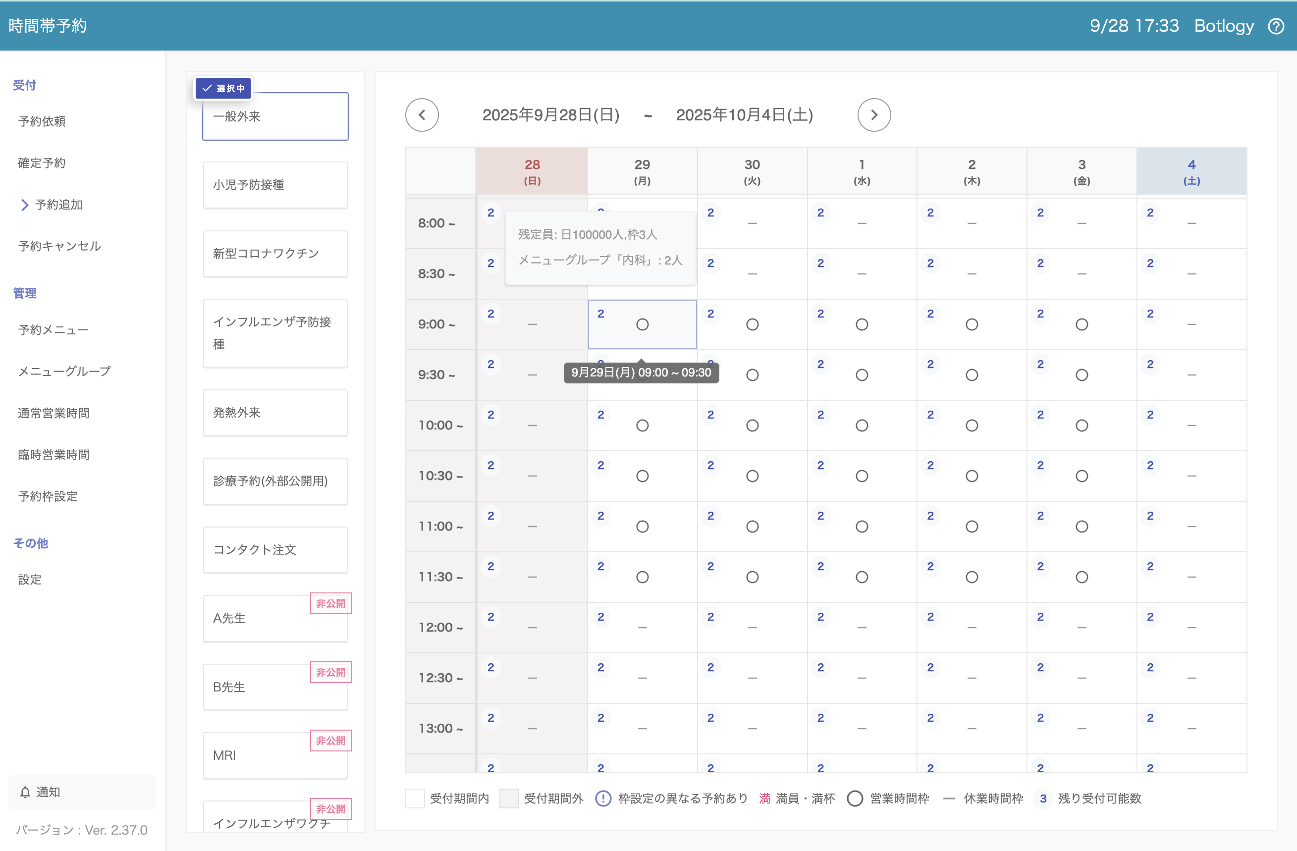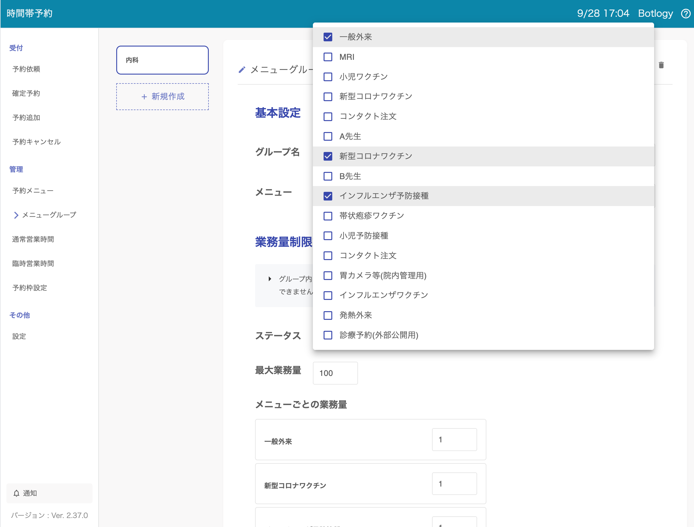 メニューグループを設定した予約メニューの「予約追加」の画面には、メニューグループの総業務量およびその予約メニューの枠ごとの上限数から計算された、予約追加可能な予約数が表示されます。