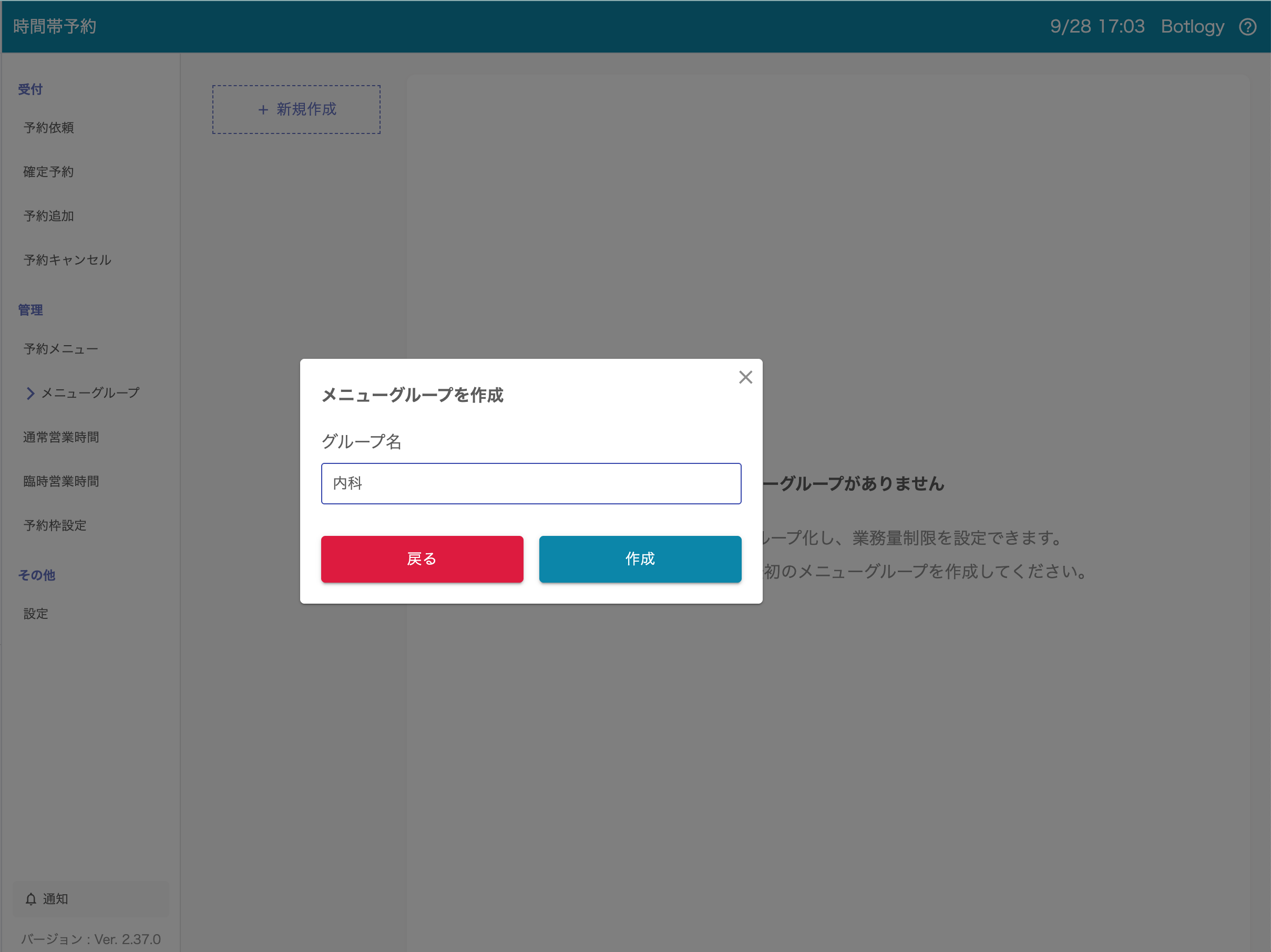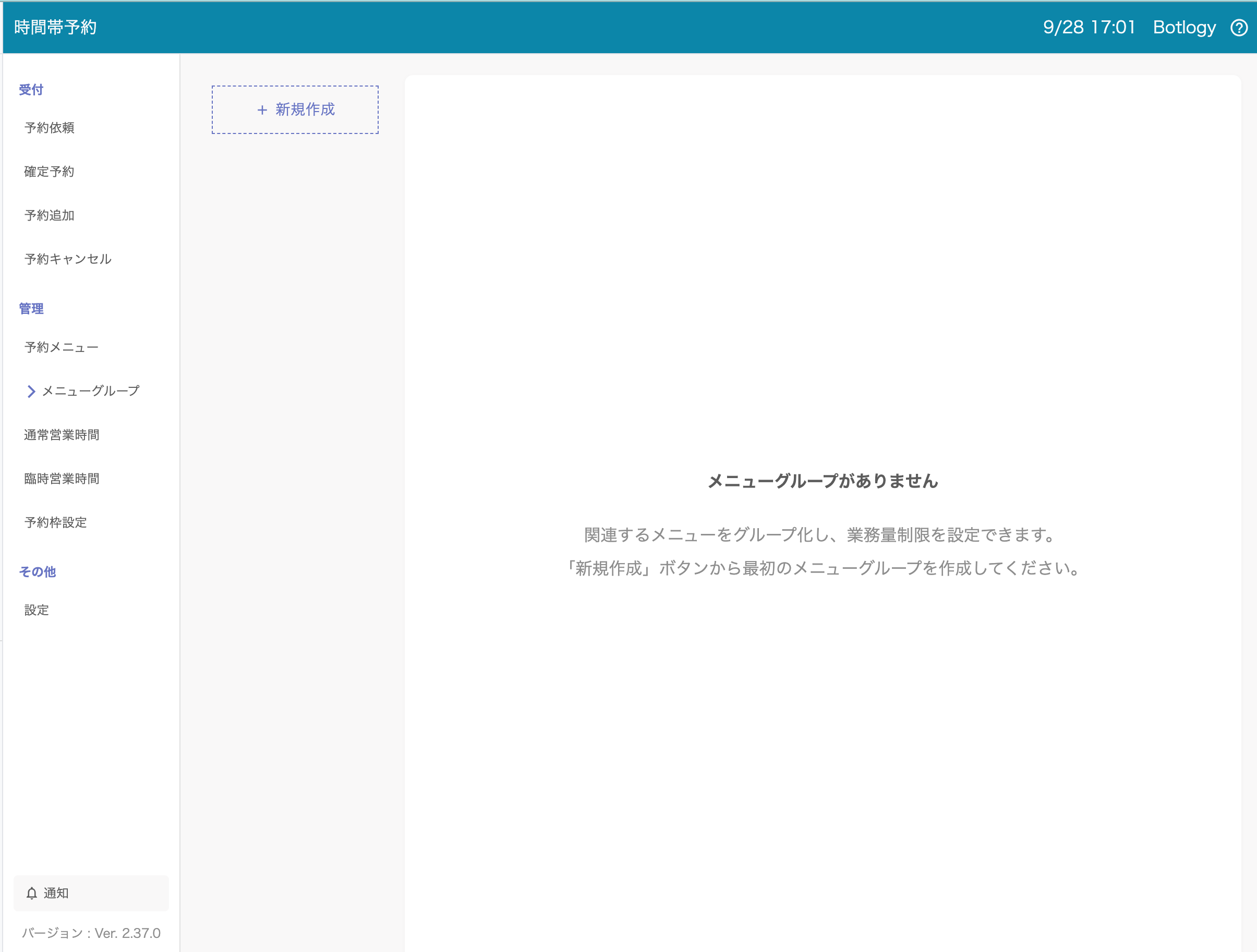 1. 時間帯予約 > 管理 > メニューグループに移動します。