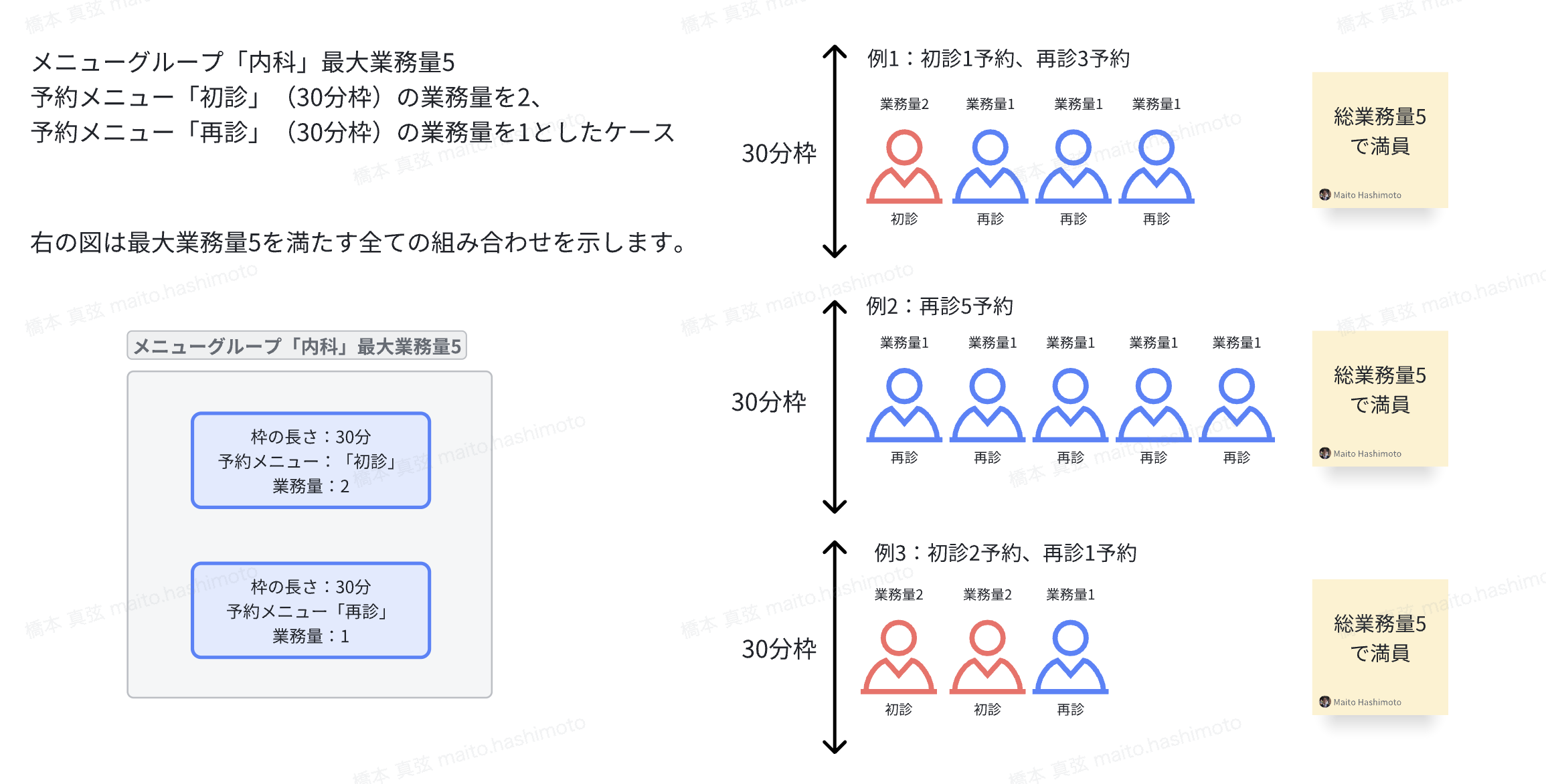 - 例3:最大業務量5で「初診」2予約、「再診」1予約 が入った場合