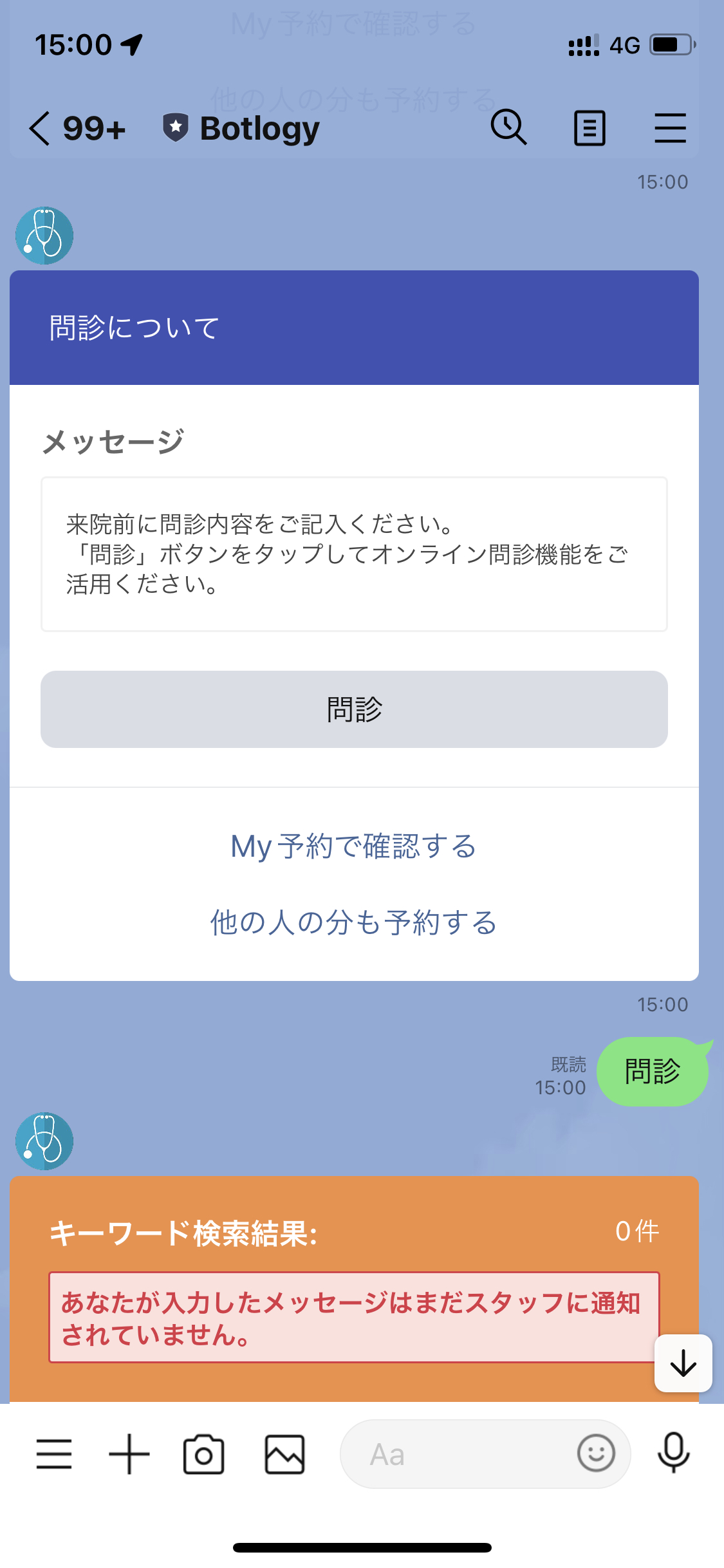 - 例えば、「問診」というキーワードをオンライン問診のページへリンクしたふきだしに設定しておくことで、リマインド時にアクションボタンをタップさせて問診への導線につなげることができます。