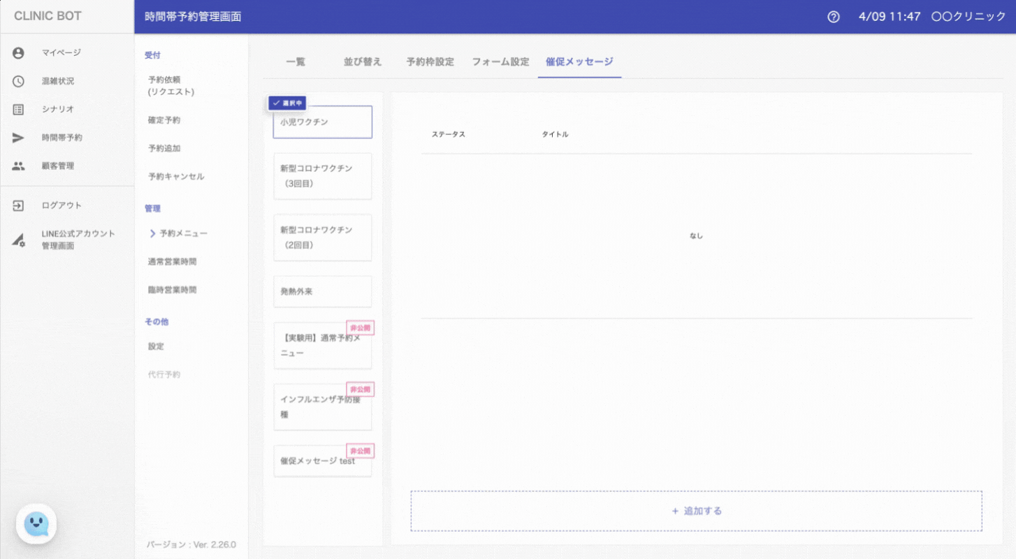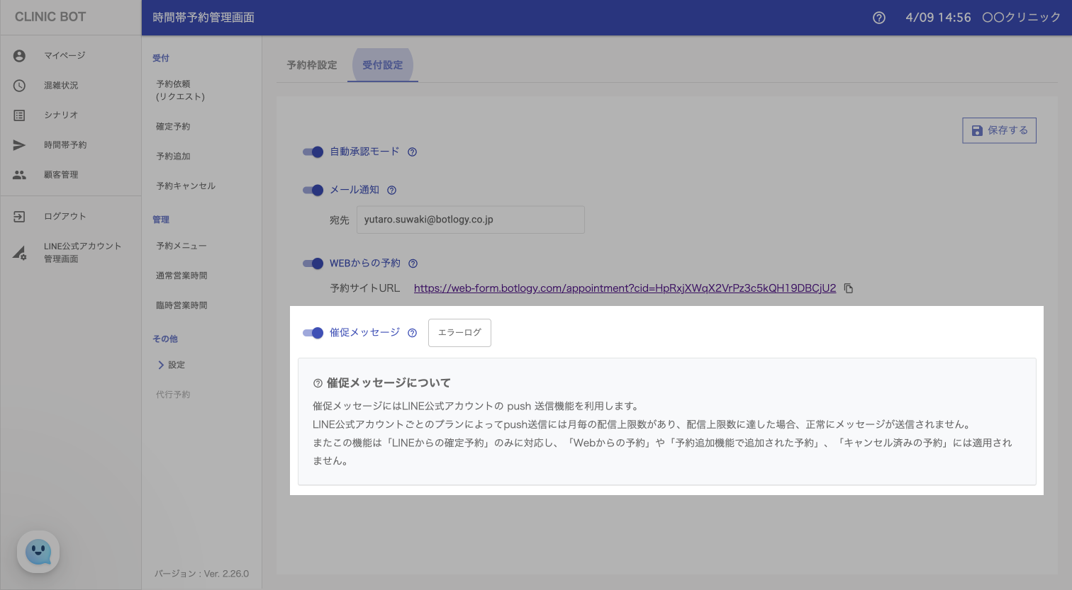 - 催促メッセージをご利用になる場合、設定 > 受付設定 から [催促メッセージ] 機能をONにしてください。