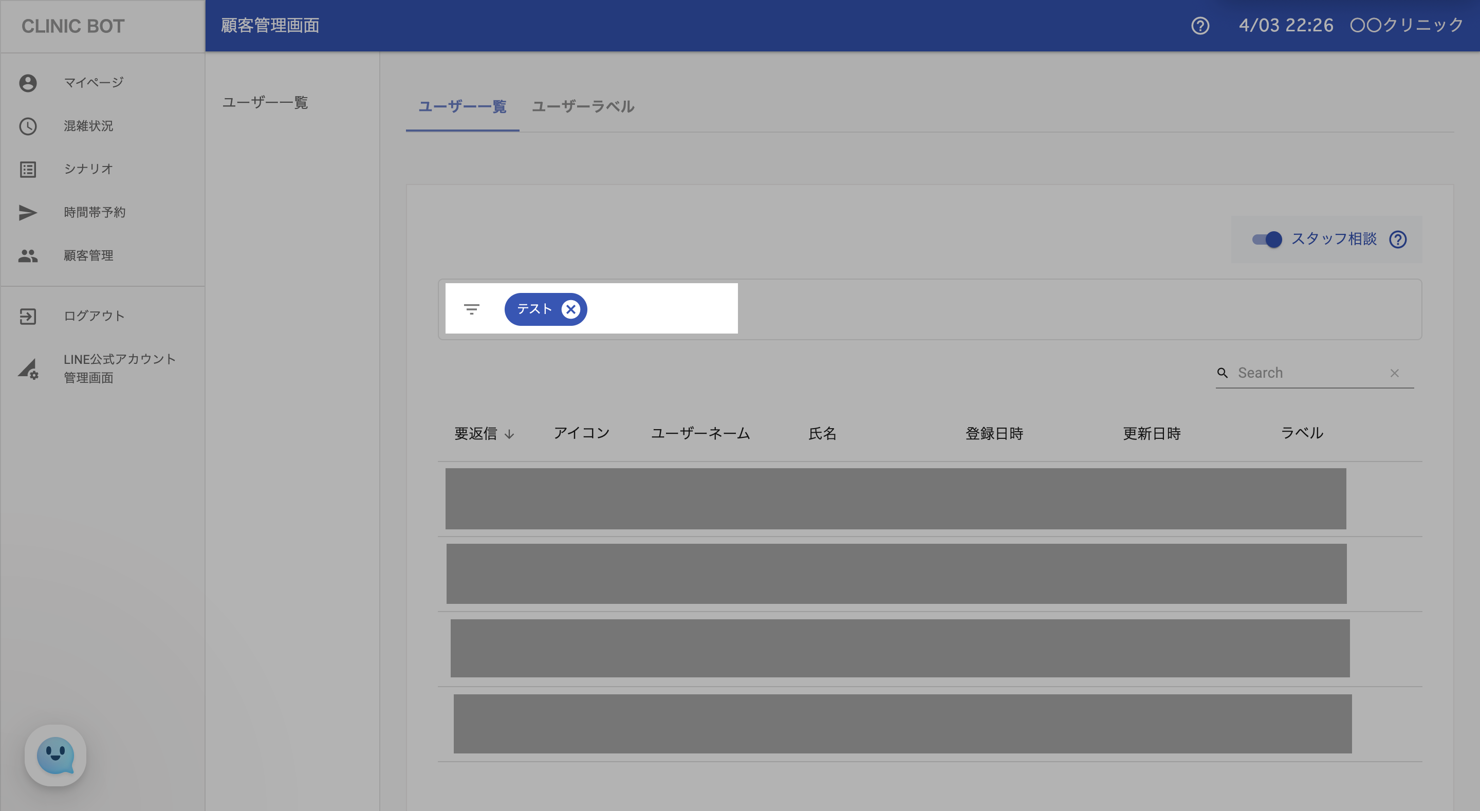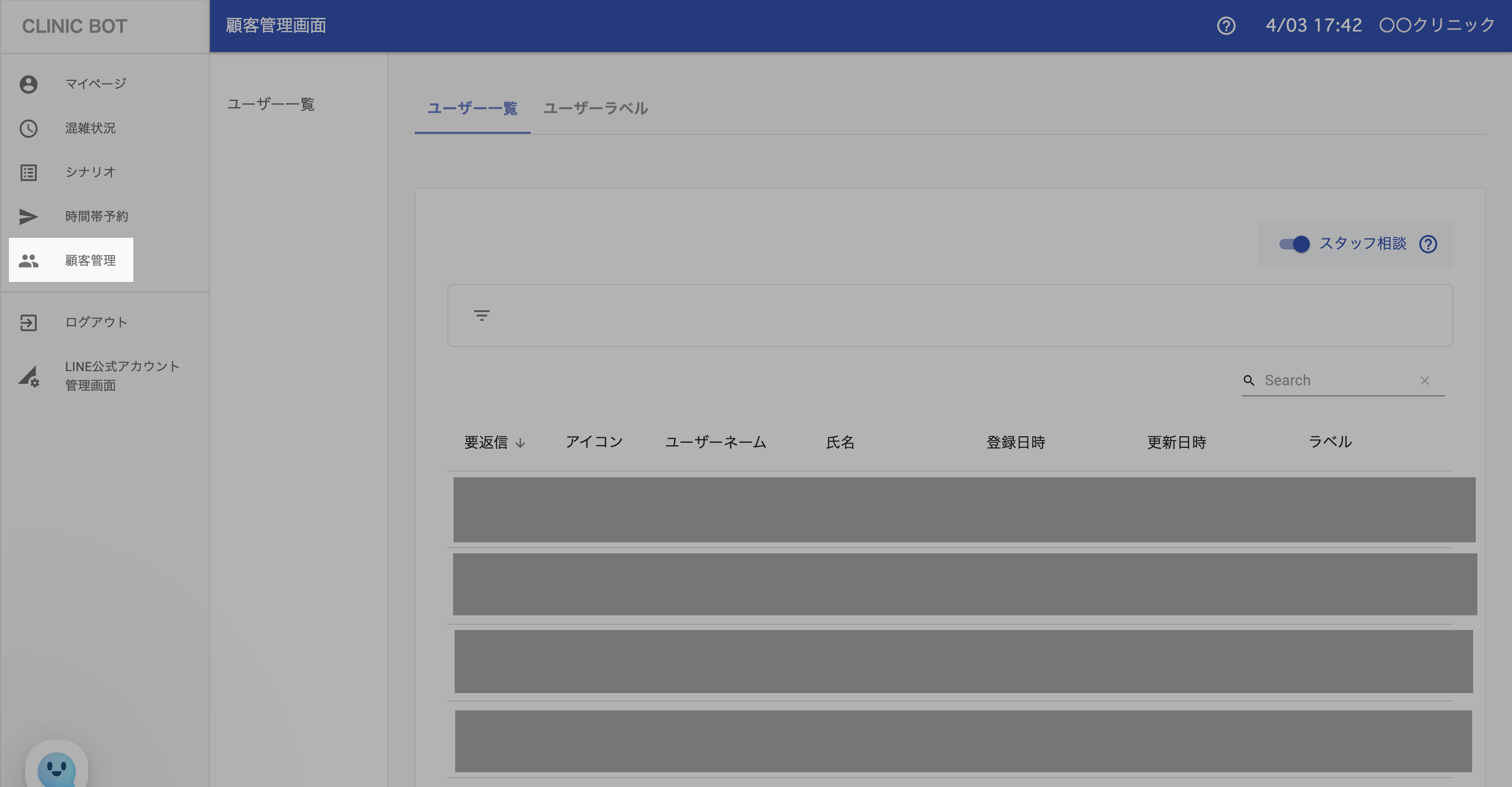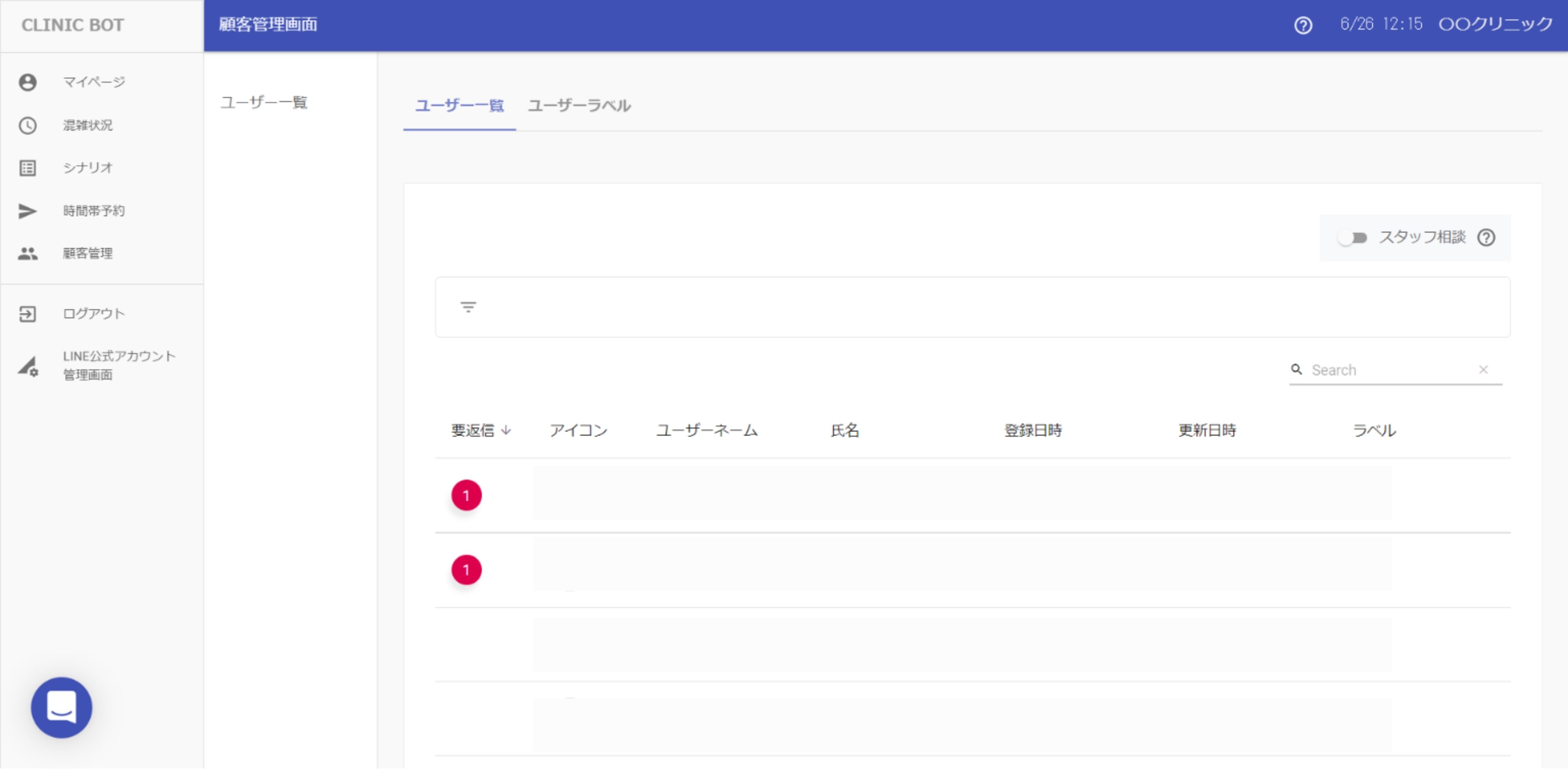 ユーザーと直接やりとりするためにはスタッフ相談をONにする必要があります。 スタッフ相談をOFFにした場合、ユーザーがクリニックに直接メッセージをおくることができません。 |