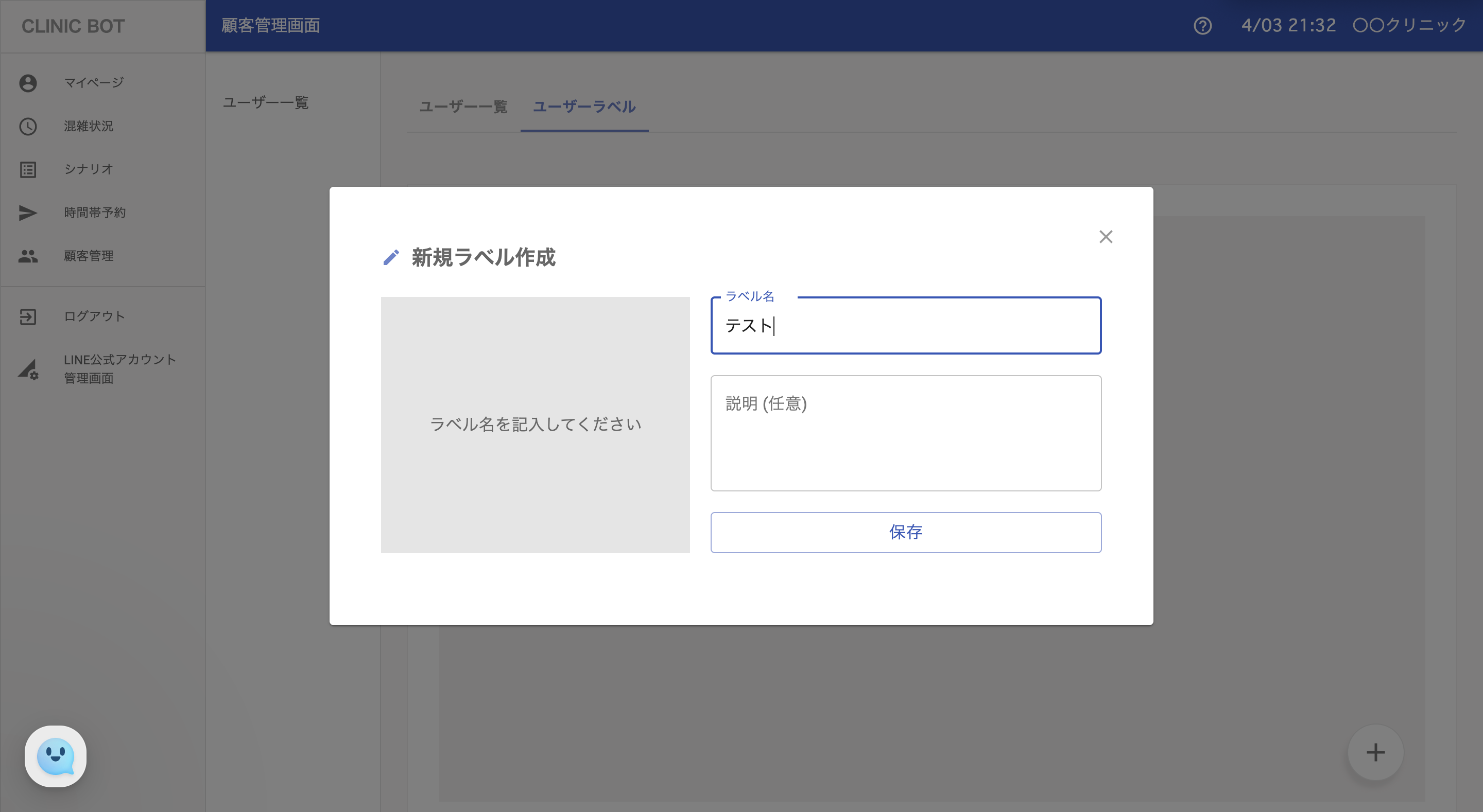 ②ラベルの入力欄に移動するのでラベル名と説明を追加します。その後[保存]ボタンをクリックするとユーザーラベルが追加されます。