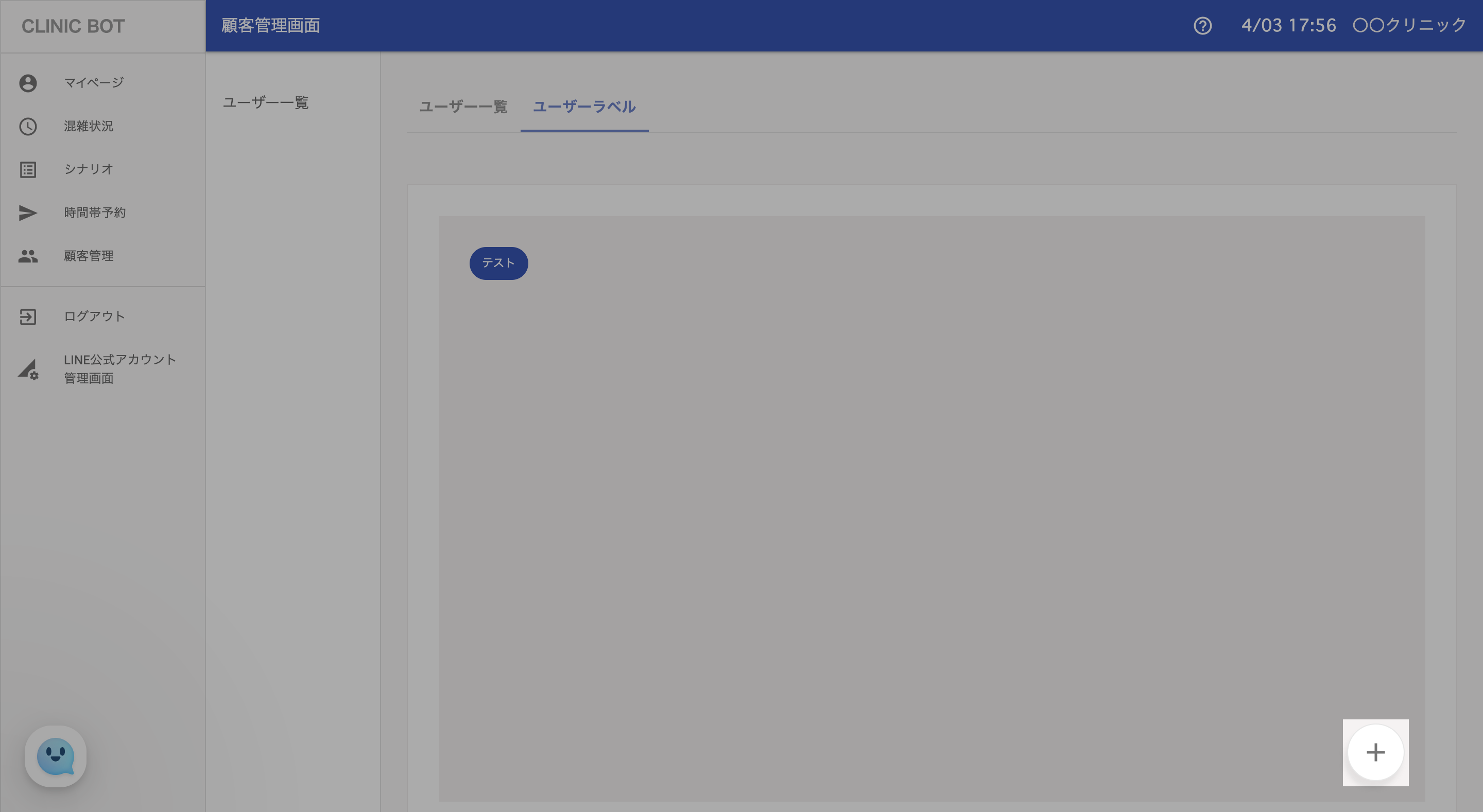①顧客管理ページの [ユーザーラベル]タグを選択したのち、ラベルを追加するために+ボタンを選択します。