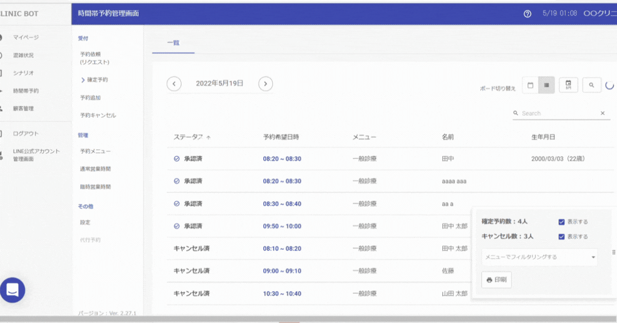 リスト表示では予約のステータス、予約希望日時、予約メニュー、名前、生年月日をリスト形式で印刷できます。
