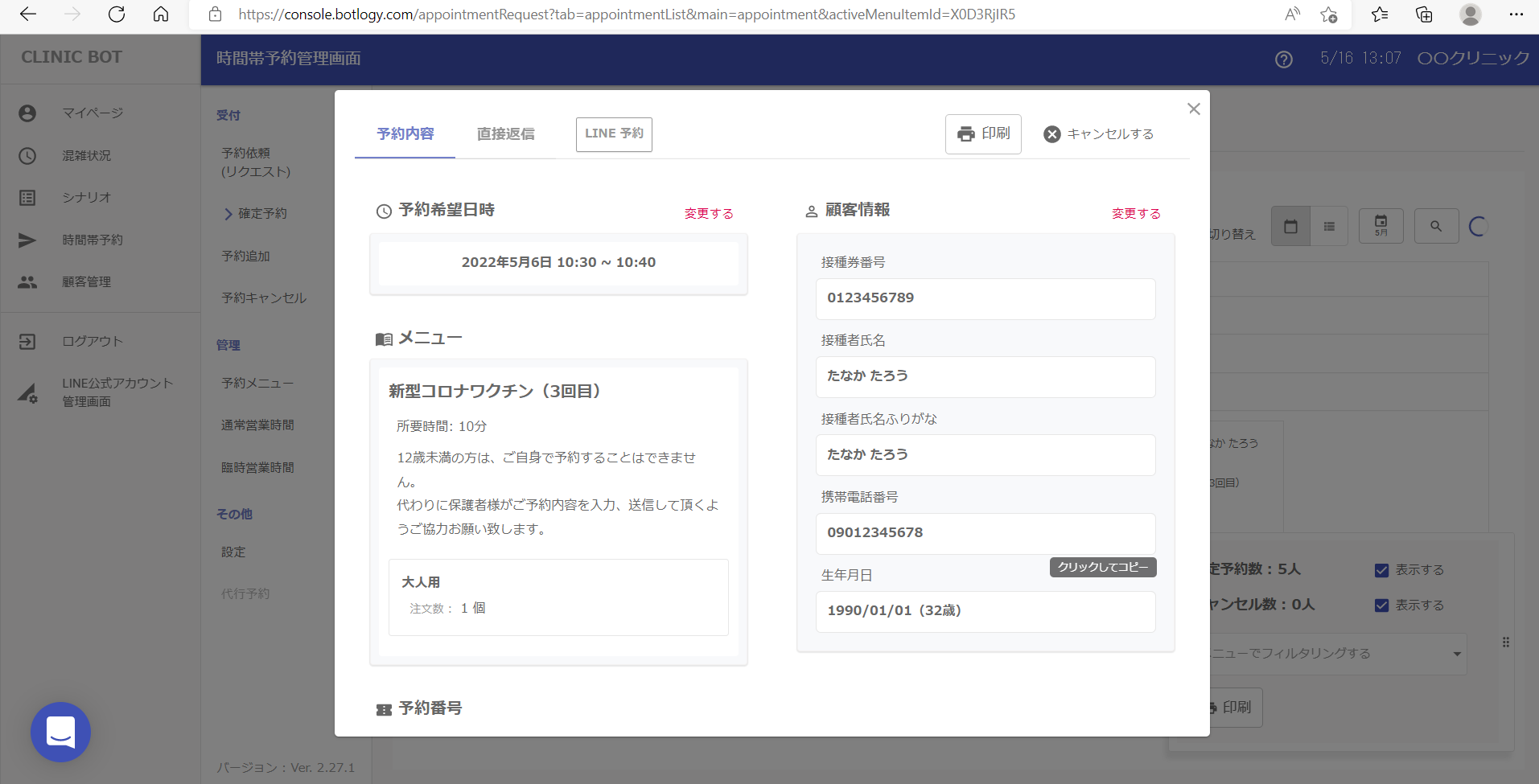 2. 詳細画面では予約希望日時・メニュー・予約番号・顧客情報が表示されます。