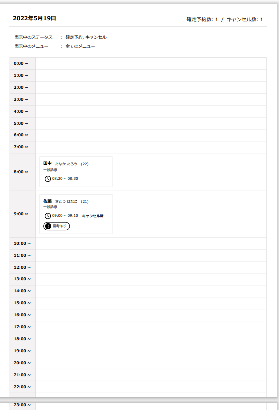 時間割表示では1時間間隔で確定予約・キャンセル済予約が並べられて表示されます。