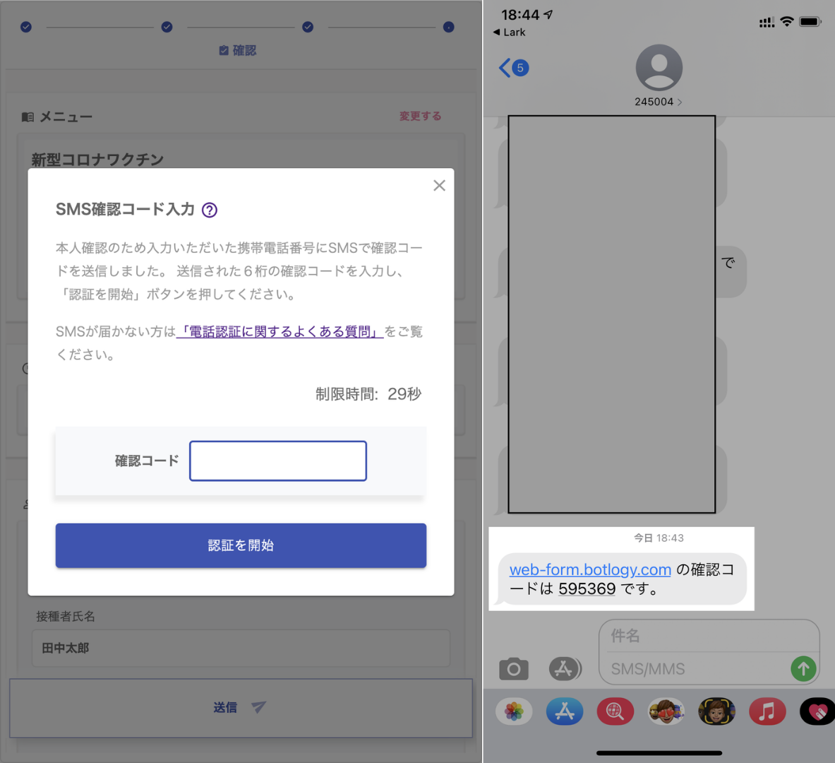 - 電話番号認証画面では以下のようなSMS確認コード入力画面(左下画像)が表示されます。