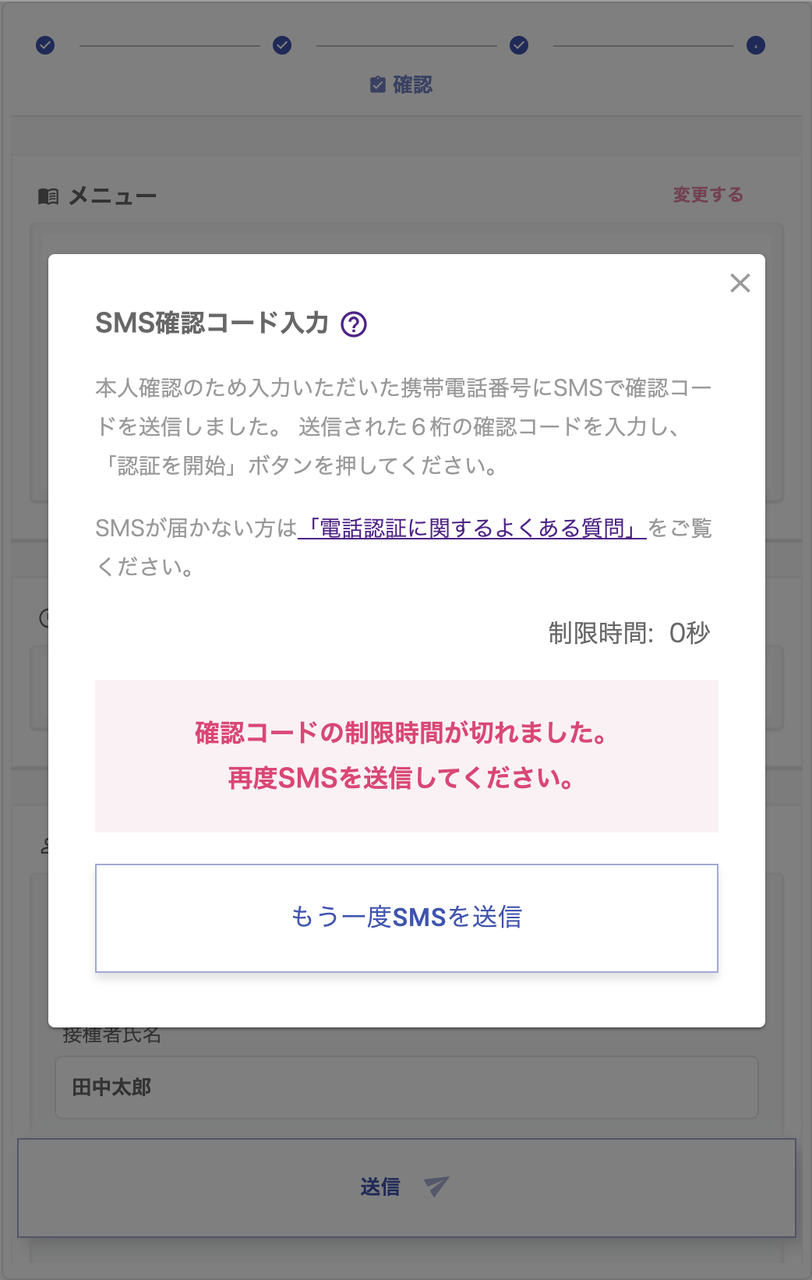 この場合は、[もう一度SMSを送信]を押して、確認コードを取得後入力してください。