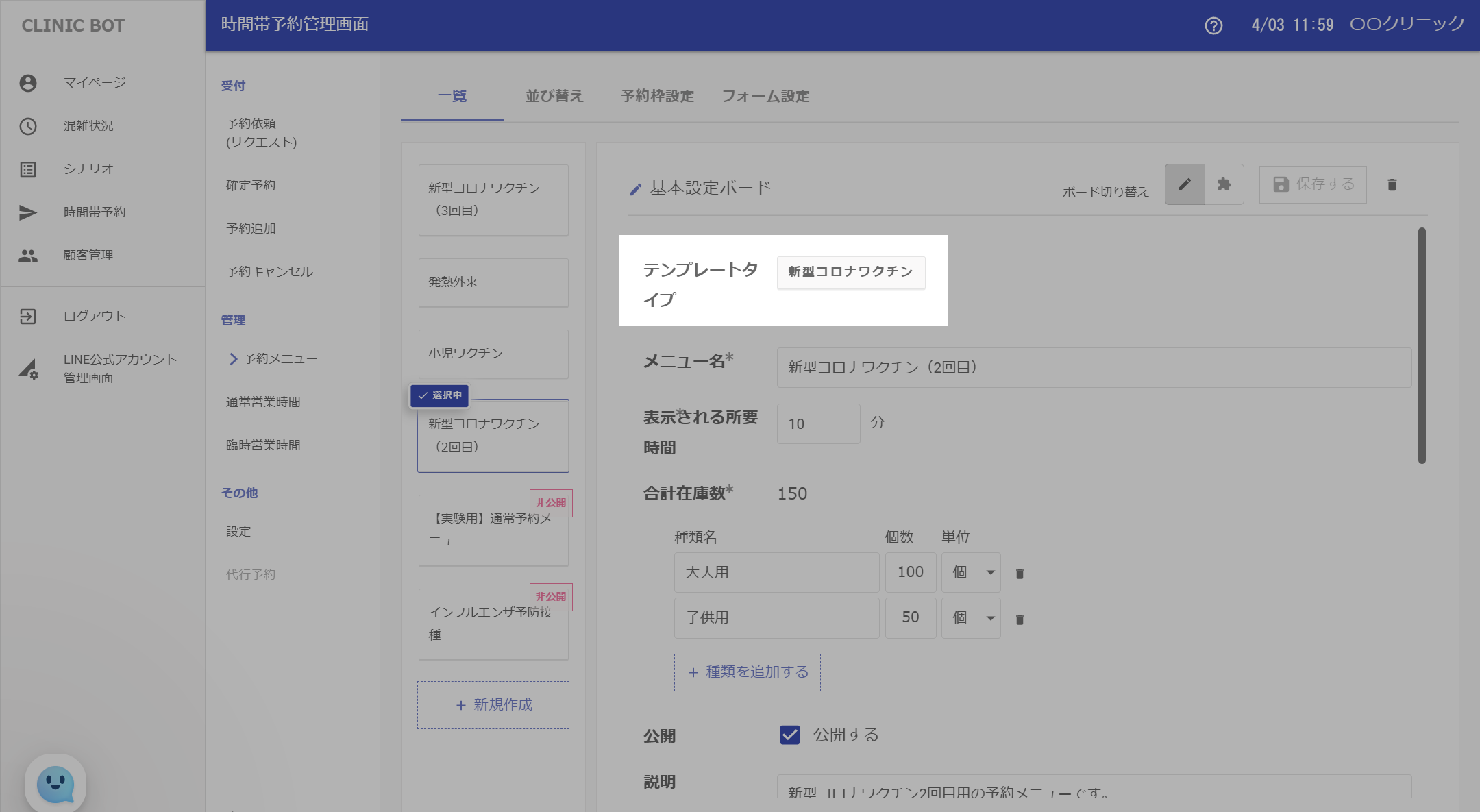 [新型コロナワクチン] のテンプレートで作成されたメニューは予約メニューの基本設定ボードの最初にテンプレートタイプとして表示されます。