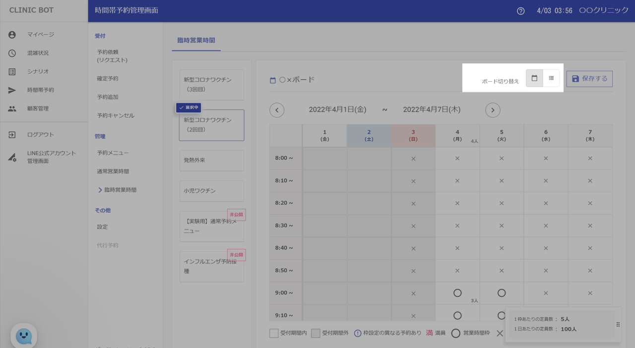 [ボード切り替え] で予約を受け付けている時間の表示を、〇×ボードと一覧ボードに切り替えることができます。