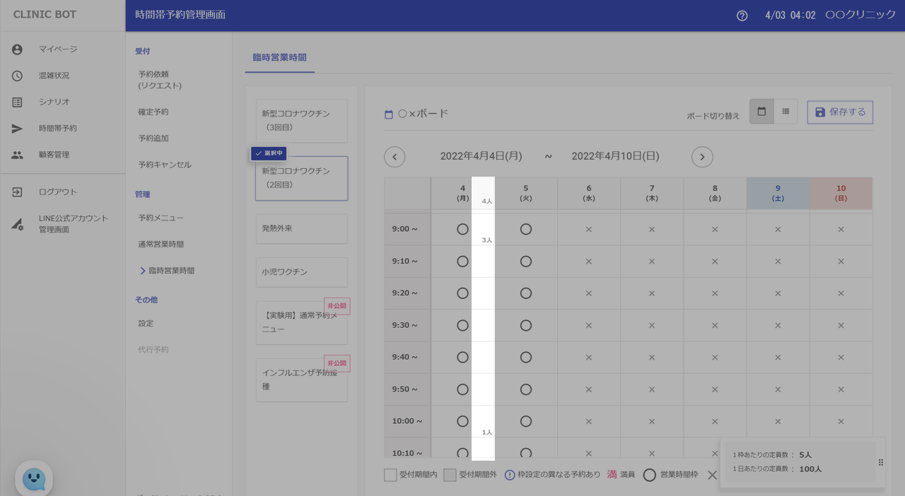 例えば新型コロナワクチン(2回目)のメニューの4月5日(火)の営業時間を通常の9:00~12:00から9:00~11:00, 11:30~12:00にしたいとします。