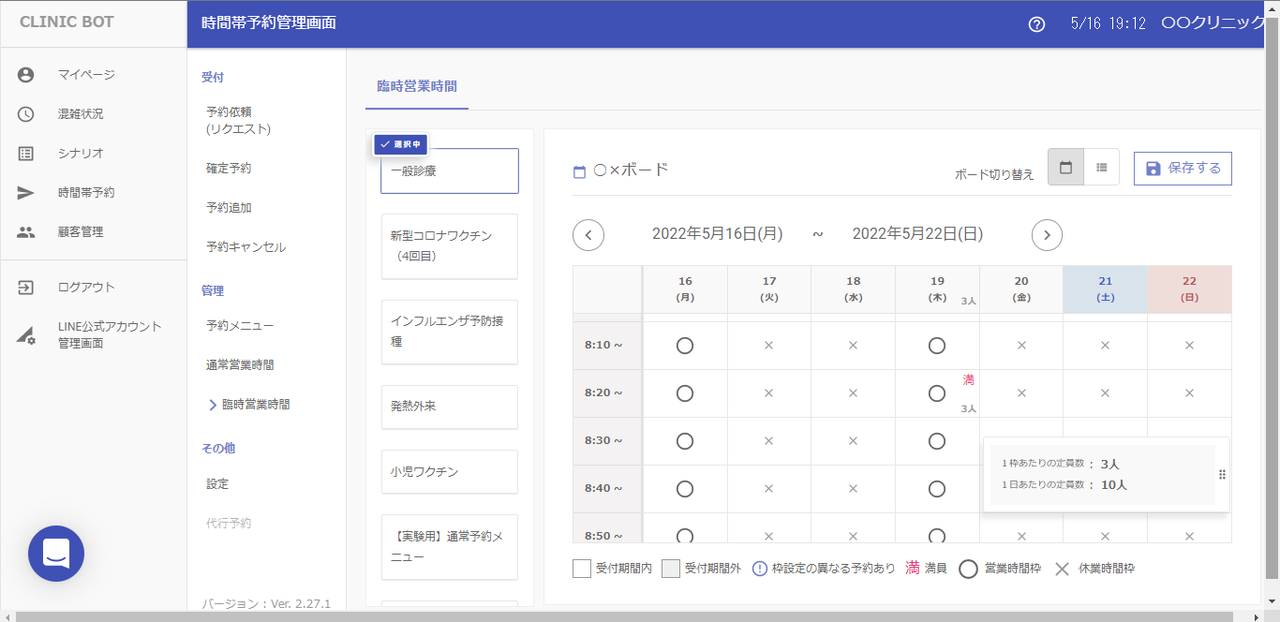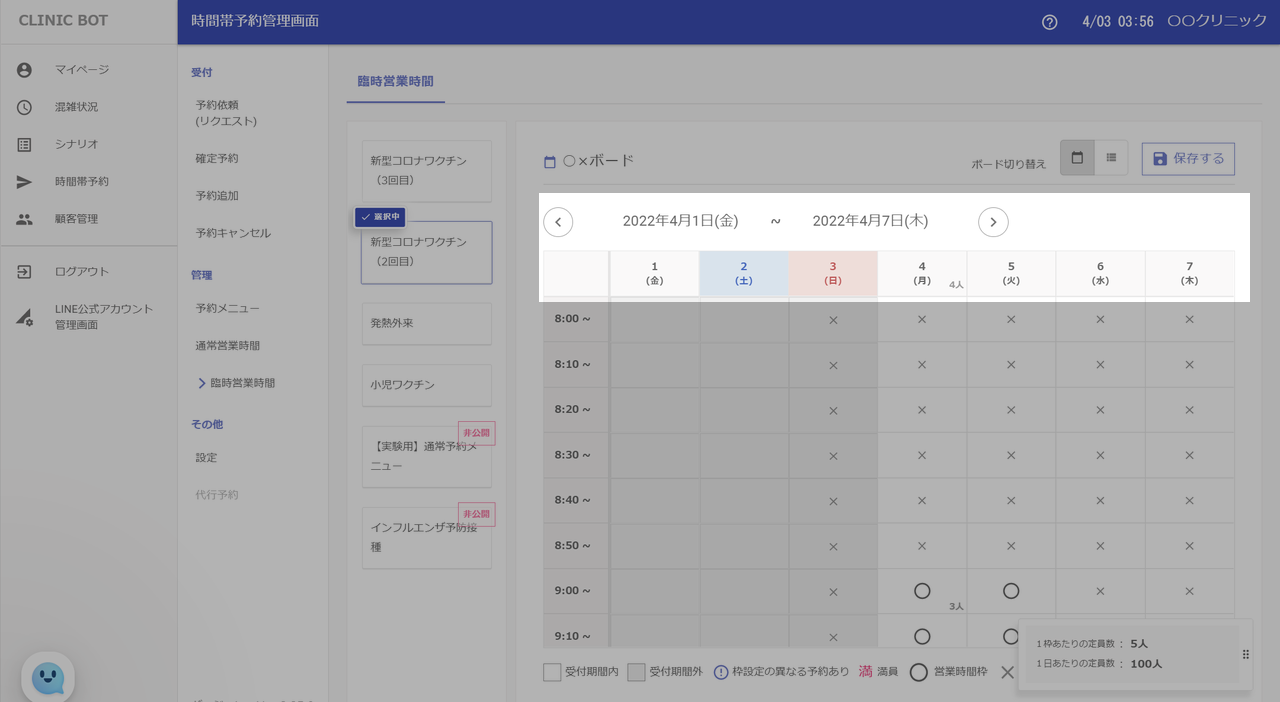 ○×ボードでは予約枠ごとに営業可否を変更でき、