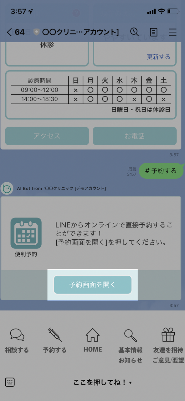③トークに下のような画像が送信されるので「予約画面を開く」を選択