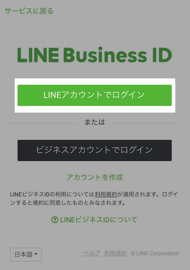 ①LINE Business ID にアクセスして、「LINEアカウントでログイン」をクリック