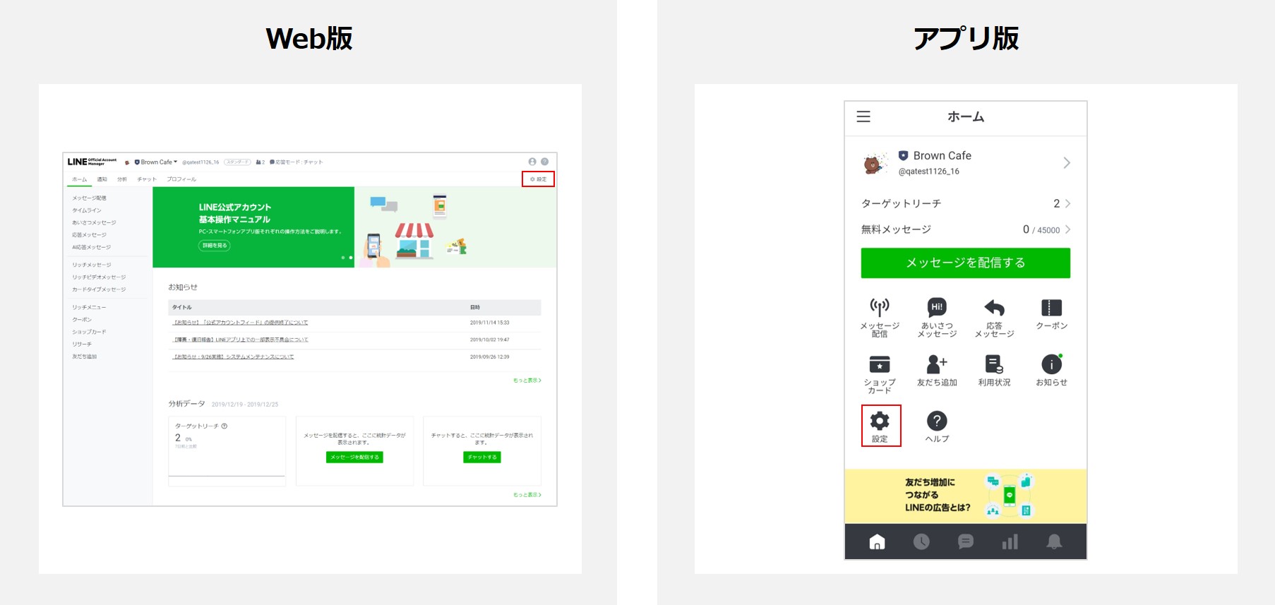 ①LINE Official Account Manager(LINE公式アカウント管理画面)にアクセスし、右上の「設定」(アプリ版はメニュー内の設定をタップ)ボタンをクリック