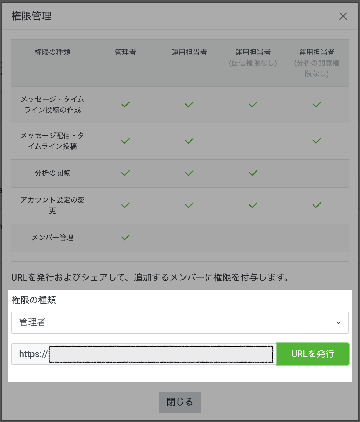 ②権限の種類「管理者」を選択後、[URLを発行]を選択します。