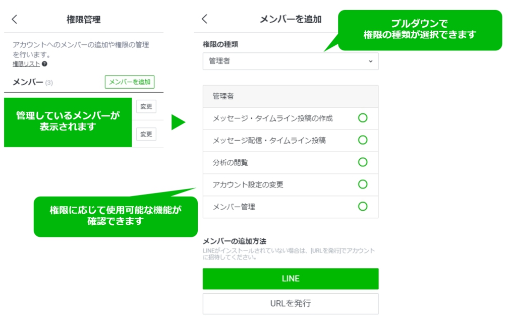 LINE Official Account Managerの権限を委任されるには、すでにLINE Official Account Managerの管理権限を持っている人から権限URLを発行してもらう必要があります。また、すでに管理者権限を持っているユーザーは、メンバーのリストから権限の変更や削除が可能です。
