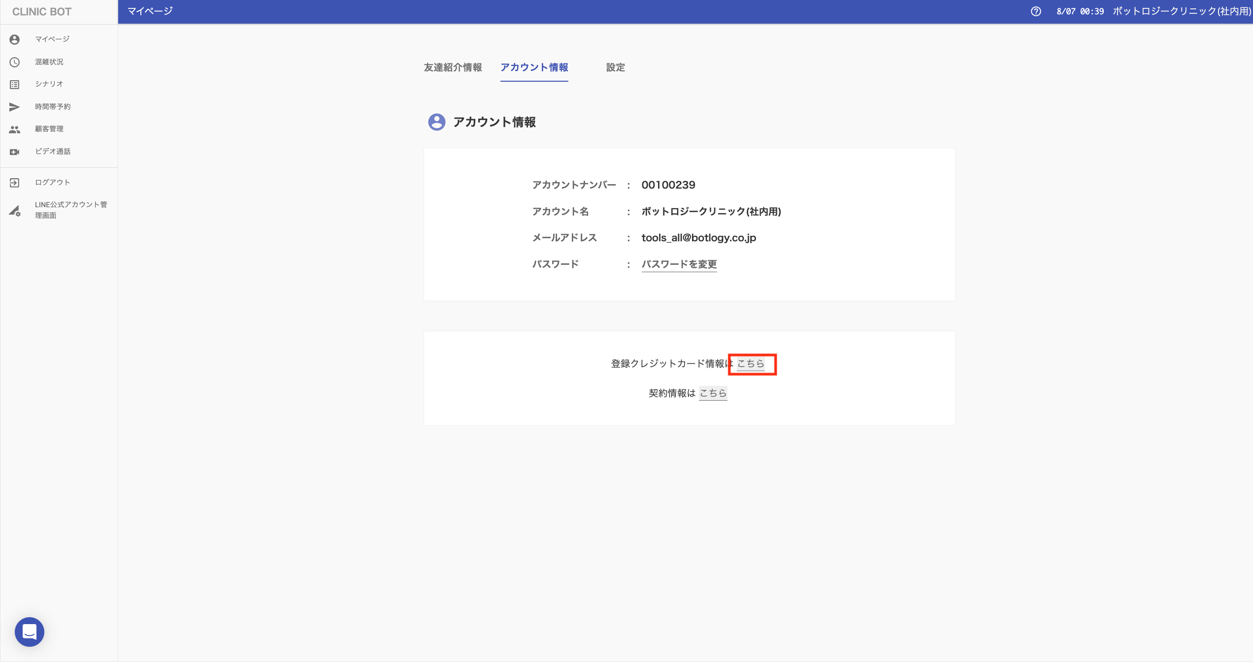 [マイページ] > [アカウント情報] タブへ移動します。ページ下部の登録クレジットカード情報は[こちら]ボタンをクリックします。