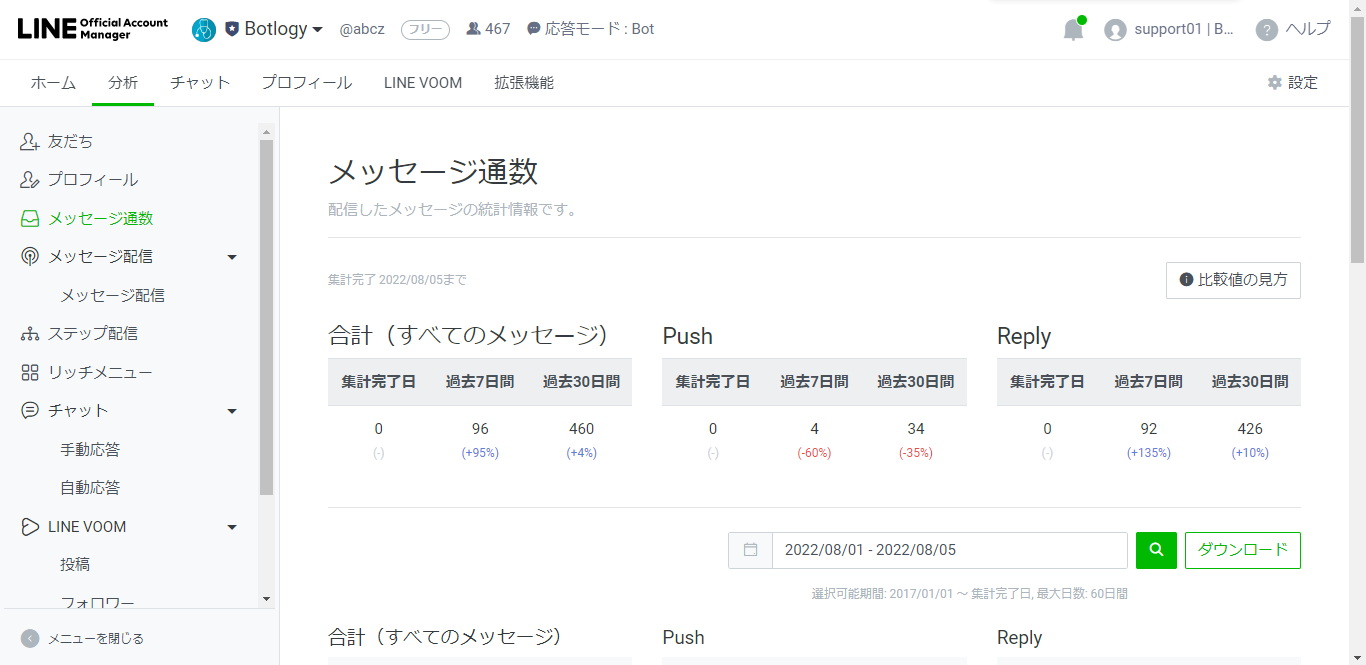 [LINE official Account Manager]>[分析]>[メッセージ通数]から、API Pushの件数を確認できます。