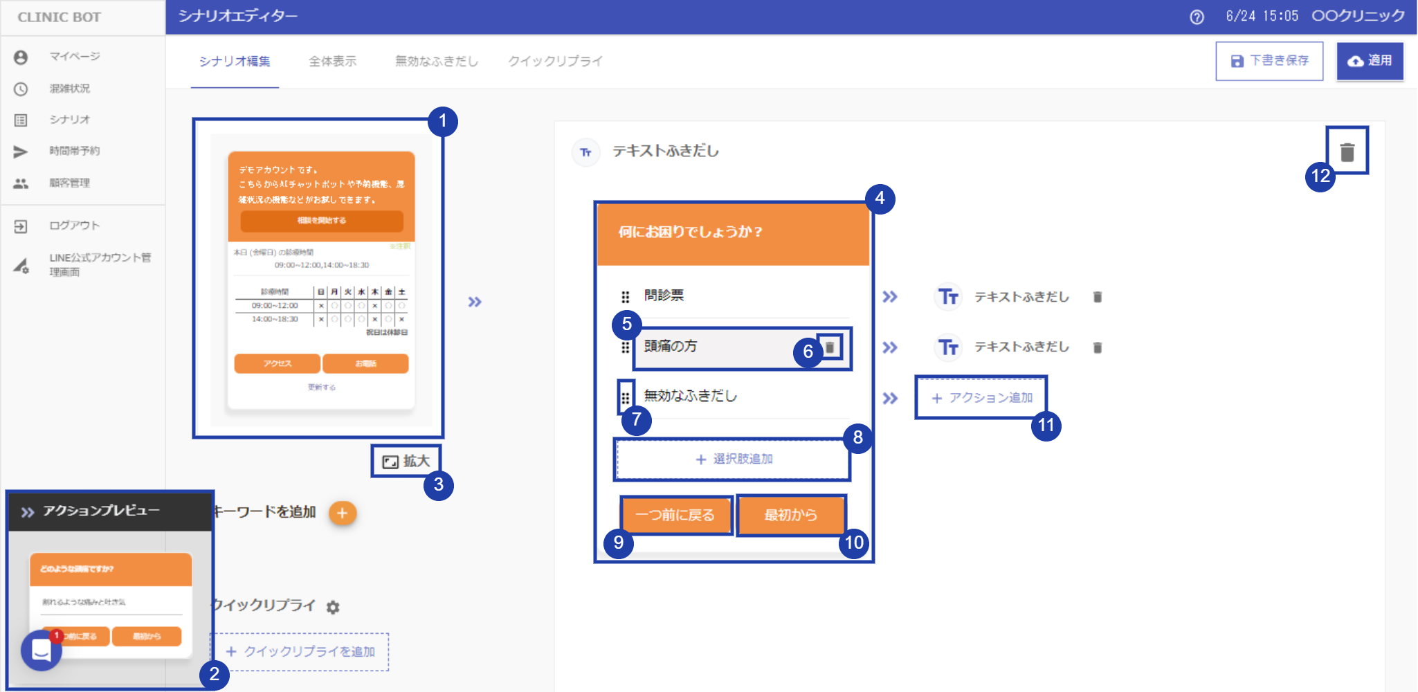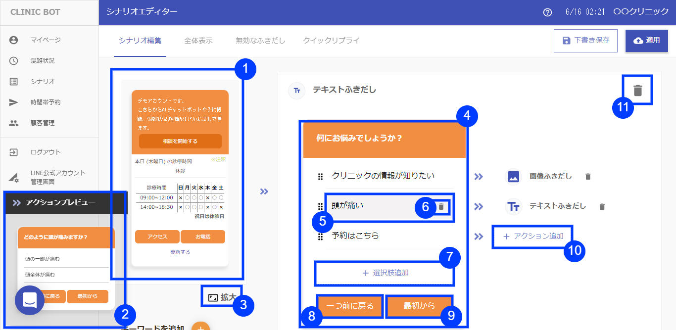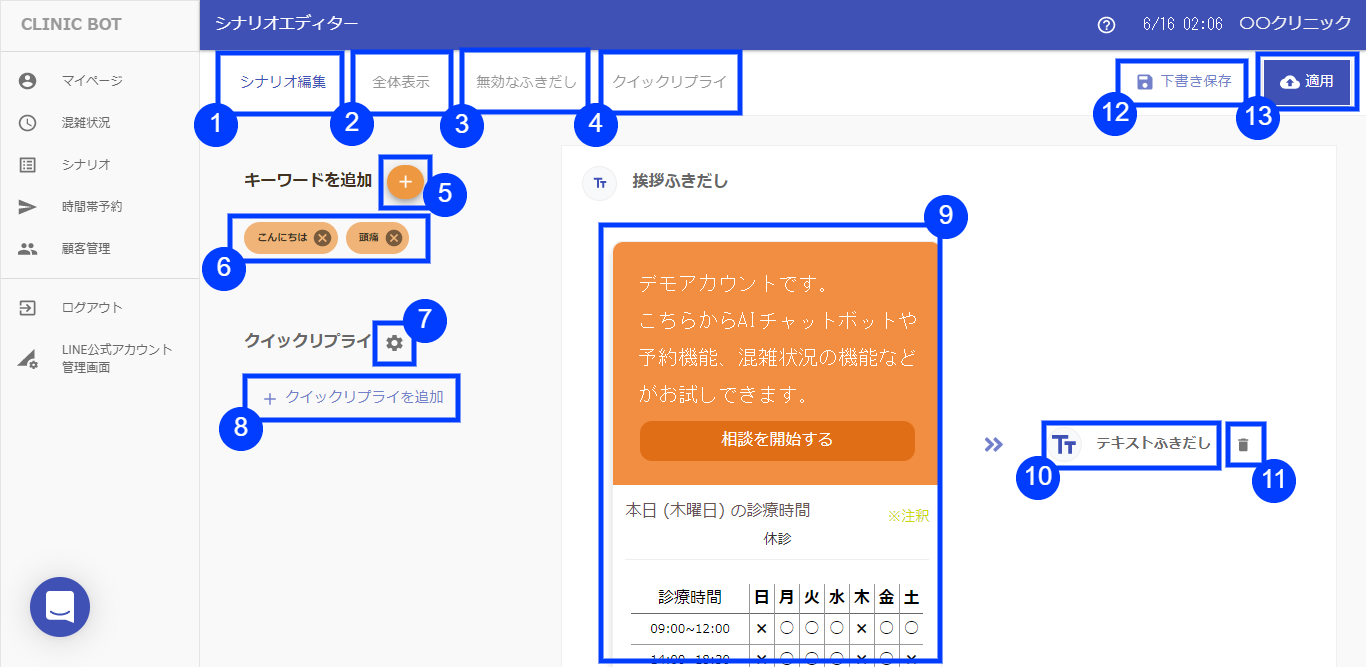 ⓭適用ボタン:シナリオを適用します。LINEトーク画面に反映されるようになります