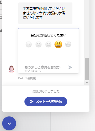 このように、チャットサポートが終了しますと、会話を5段階で評価し、メッセージを送信することが可能です。