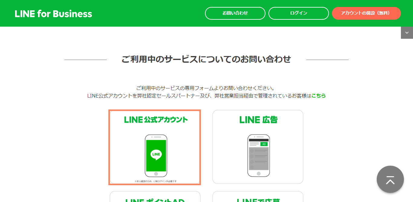 ③「ご利用中のサービスについてのお問い合わせ」の中の「LINE公式アカウント」を選択し、ログインする