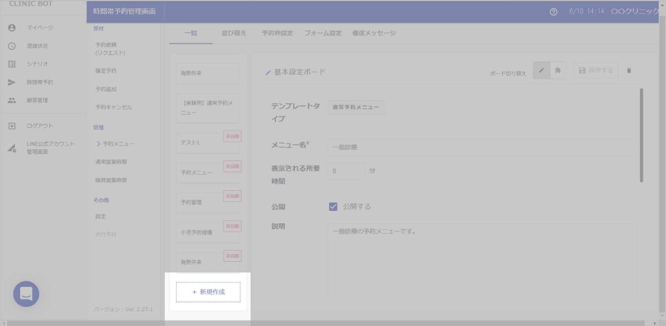 ①予約メニューウィンドウ>一覧タブ内の[+新規作成]ボタンをクリックします