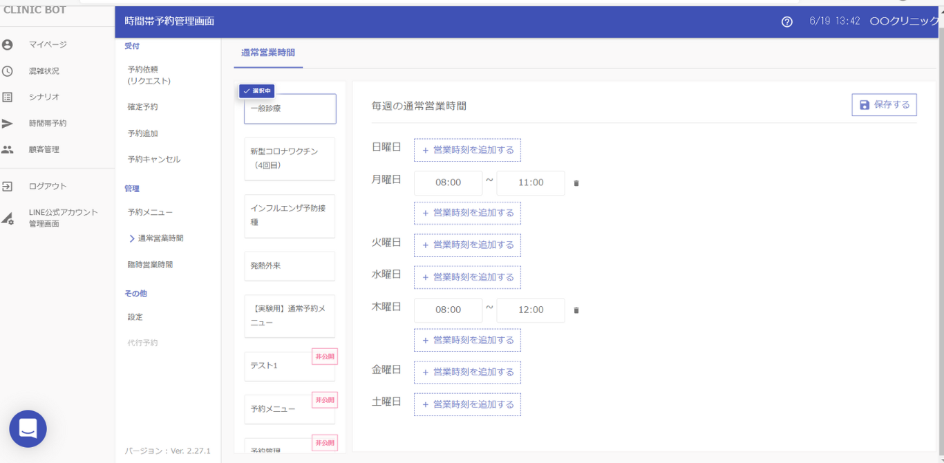 ④営業時間の設定を行いましょう。診療時間を入力しましょう。入力した時間帯にユーザーは予約希望日時を指定できます。通常営業時間ウィンドウから、メニューごとに営業時間を設定することができます。