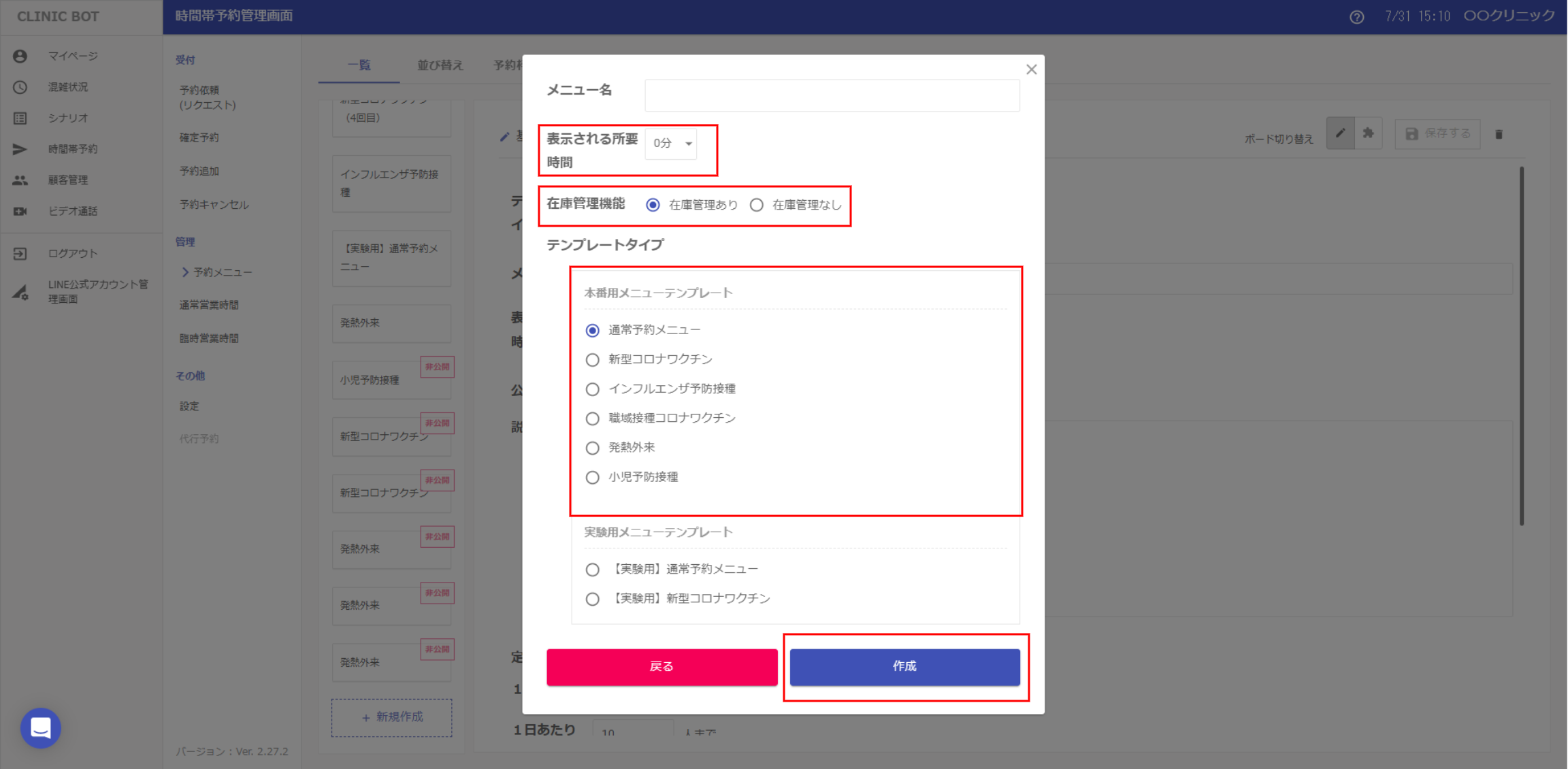 ②メニュー名・ユーザー側に表示される診察の所要時間・在庫管理機能・テンプレートタイプを設定、選択します。モーダルウィンドウの一番下にある[作成]ボタンを押すと作成できます。