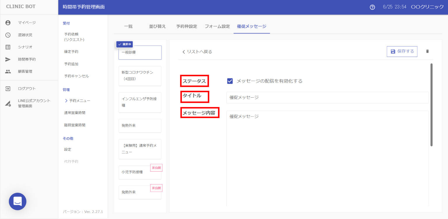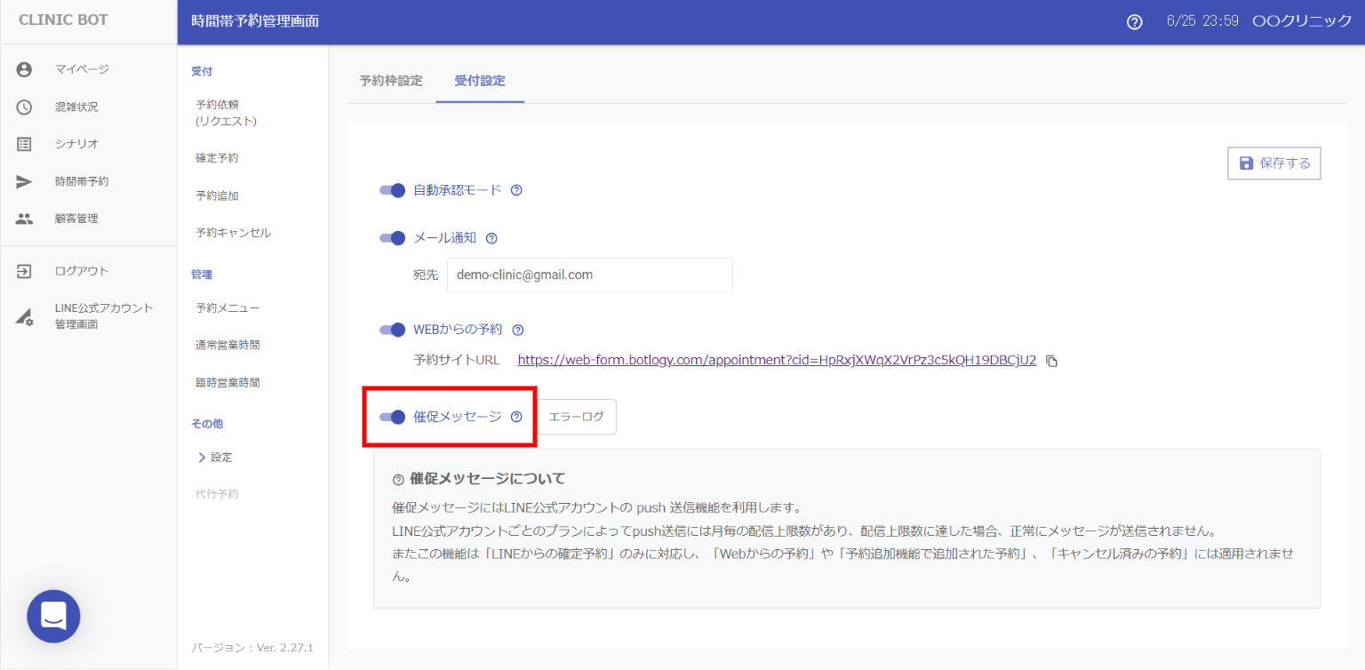 ④最後に、最上部にある[メッセージの配信を有効化する]チェックボックスにチェックが入っていることを確認し、[保存する]ボタンを押すと催促メッセージが運用開始されます。