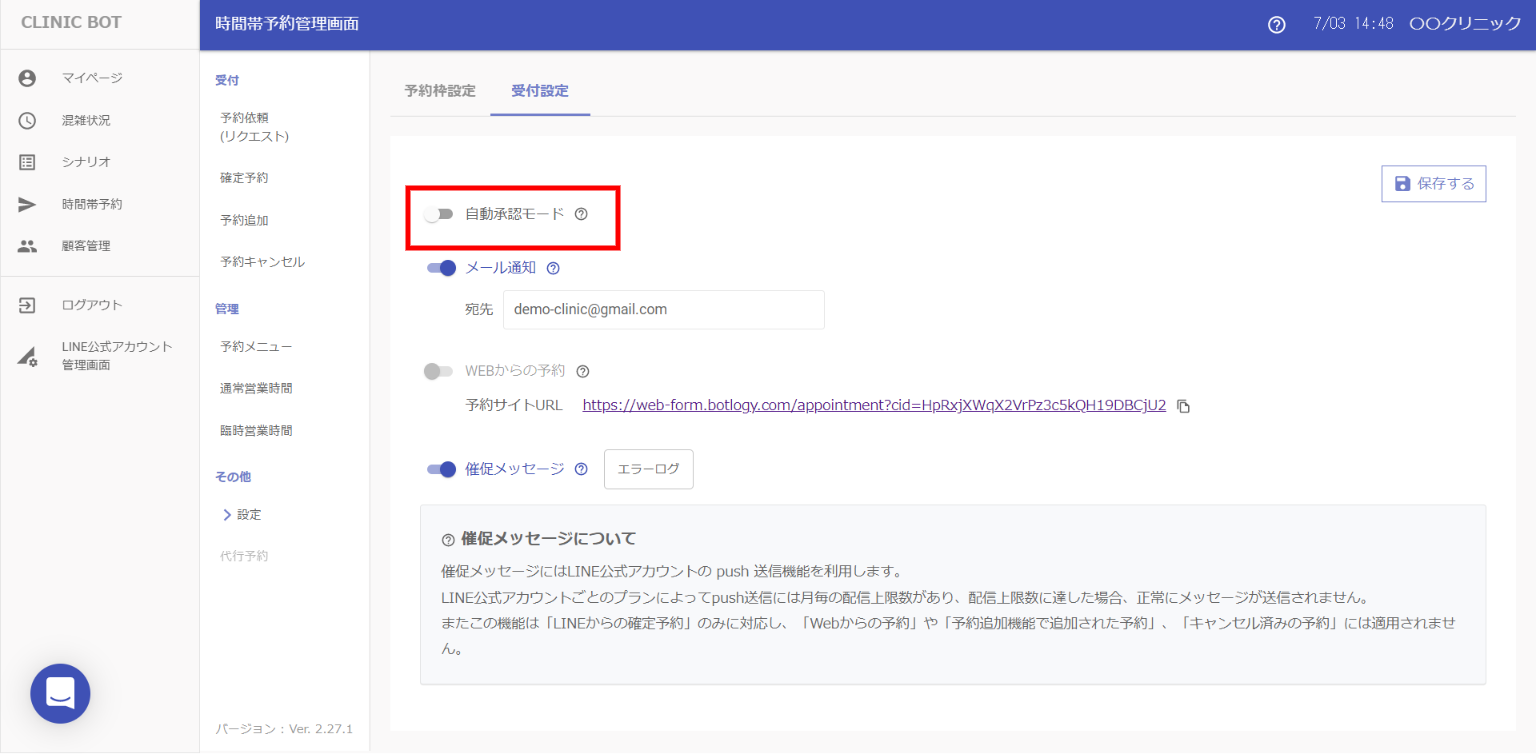 [設定]ウィンドウ>[受付設定]タブ>[自動承認モード]スイッチで承認モードの切り替えを来なうことができます。